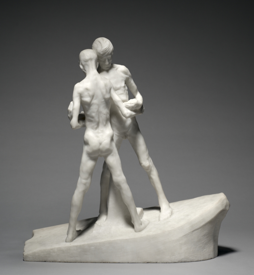Minne's marble sculpture embodies the Symbolist movement's emphasis on emotional and spiritual content, using simplified forms to convey psychological depth rather than naturalistic representation.