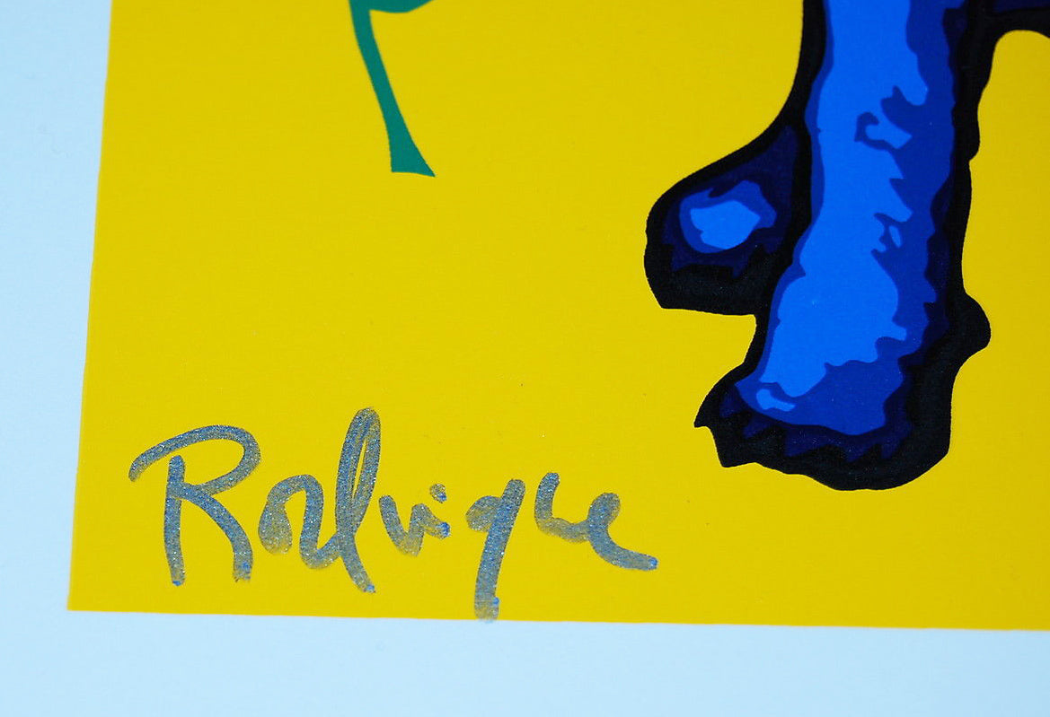 This vibrant silkscreen print showcases George Rodrigue's distinctive visual language, rendered in luminous yellows and complementary hues that capture an almost ethereal quality. The composition centers on a figure surrounded by botanical elements, presented with the graphic clarity and bold color palette characteristic of Rodrigue's printmaking practice. Created in 2002 as a printers proof, this work demonstrates the artist's mastery of the silkscreen medium, where each layer of color builds to create depth and visual richness. The relatively intimate scale of 12" x 11" makes this a compelling choice for collectors seeking Rodrigue's work in a more accessible format while maintaining the full impact of his artistic vision. Rodrigue's exploration of the figure within natural settings reflects his broader interest in creating works that balance decorative sophistication with emotional resonance. The yellow tonality that dominates this piece conveys warmth and optimism, qualities that define much of his oeuvre. As a printers proof from a limited edition, this print occupies a special place within the artist's output, representing the experimental and collaborative process inherent in fine art printmaking. For collectors, this work offers an opportunity to acquire a significant example of Rodrigue's silkscreen practice, where the technical precision of the medium combines with his signature aesthetic sensibility.