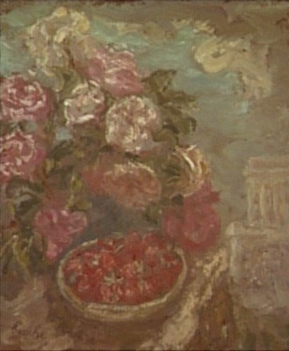 Intimate still life painting reveals Bouche's Post-Impressionist sensibilities through its careful balance of color and form in everyday objects.
