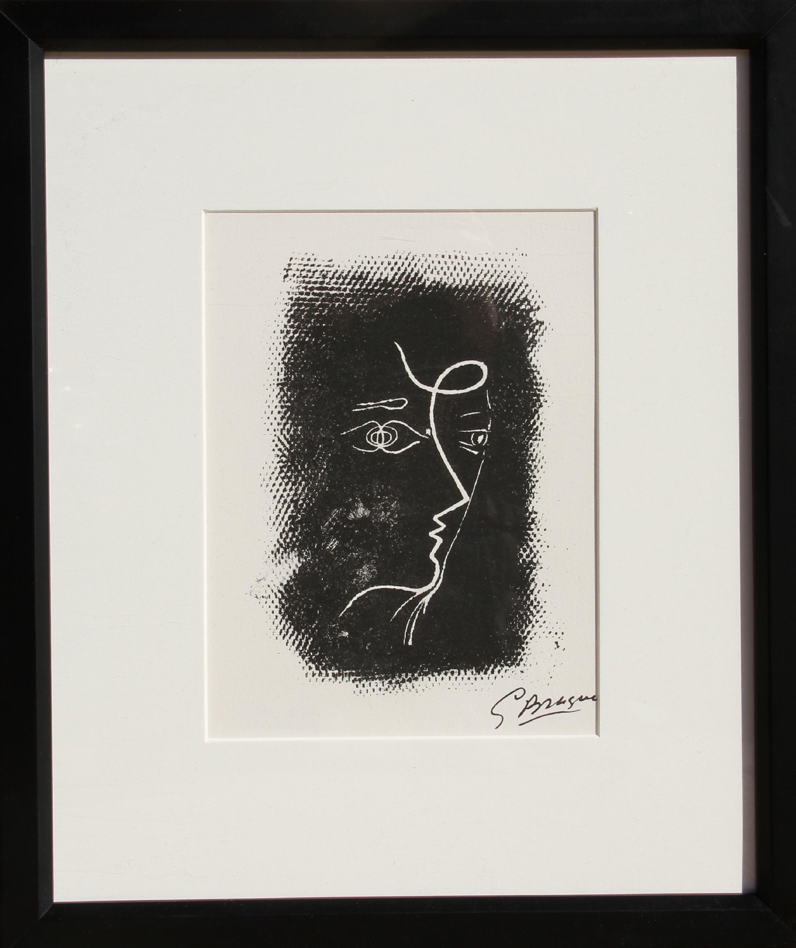 "Profil de Femme" is a lithograph by Georges Braque that exemplifies the artist's innovative approach to depicting the human form through Cubist principles. The work presents a woman's profile reduced to geometric planes and abstracted shapes, characteristic of Braque's analytical style that fragmented and reconstructed visual reality. This piece reflects the artist's exploration of how multiple perspectives and simplified forms could convey essential qualities of a subject rather than mere representation.