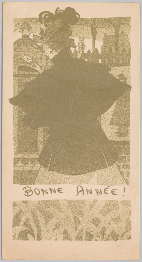 Art Nouveau decorative style applied to greeting card design demonstrates the movement's influence on popular culture. De Feure's elegant linear work exemplifies French decorative arts at their peak.