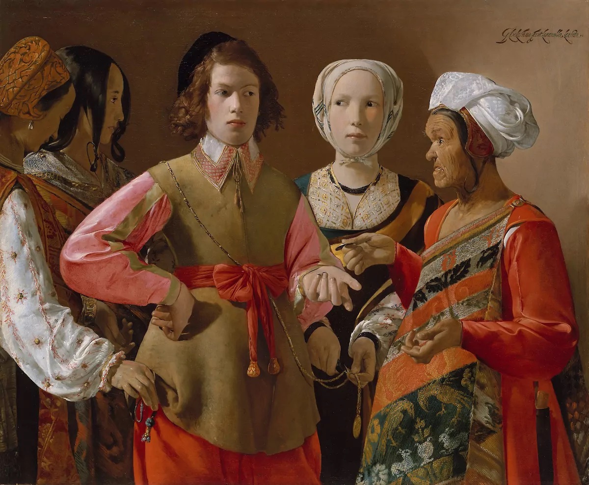 This iconic Baroque masterpiece by Georges de La Tour depicts a naive young man having his fortune told by an elderly Romani woman while surrounding figures covertly pickpocket him. The composition is celebrated for its dramatic chiaroscuro lighting, richly layered narrative, and extraordinarily detailed rendering of textures and costumes. Dated between 1633 and 1639, it stands as a definitive example of 17th century French genre painting and La Tour's penetrating psychological storytelling. The work carries a visible signature in the upper right corner of the canvas.