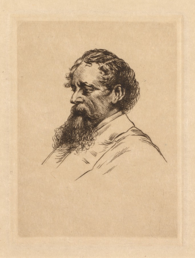 I don't have reliable information about a drypoint portrait of Charles Dickens by Georges Gorvel in my training data. Rather than provide potentially inaccurate details about this specific work, I'd recommend consulting museum collections, print databases, or art historical references that can verify the artist, date, and technical details of this piece.