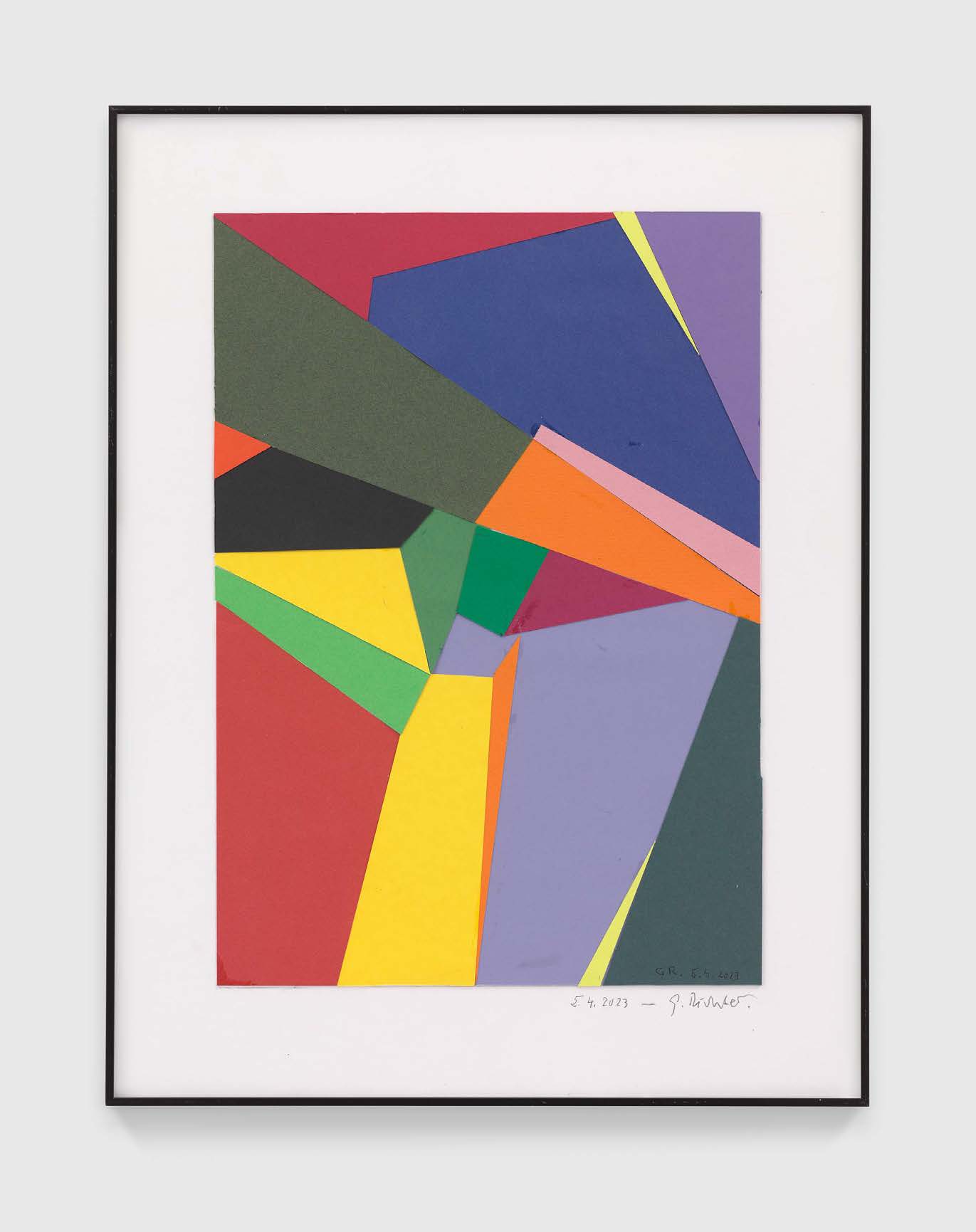 This 2023 collage represents Richter's late-career engagement with intimate, small-scale works on paper, a practice he has pursued with remarkable consistency into his nineties. The work employs torn and assembled paper fragments, reflecting his longstanding interest in the tension between chance and control. Collage allows Richter to explore compositional relationships without the physical demands of large-scale painting. Dated works like this one signal his diary-like approach to art-making, treating each piece as a record of a specific moment in time.