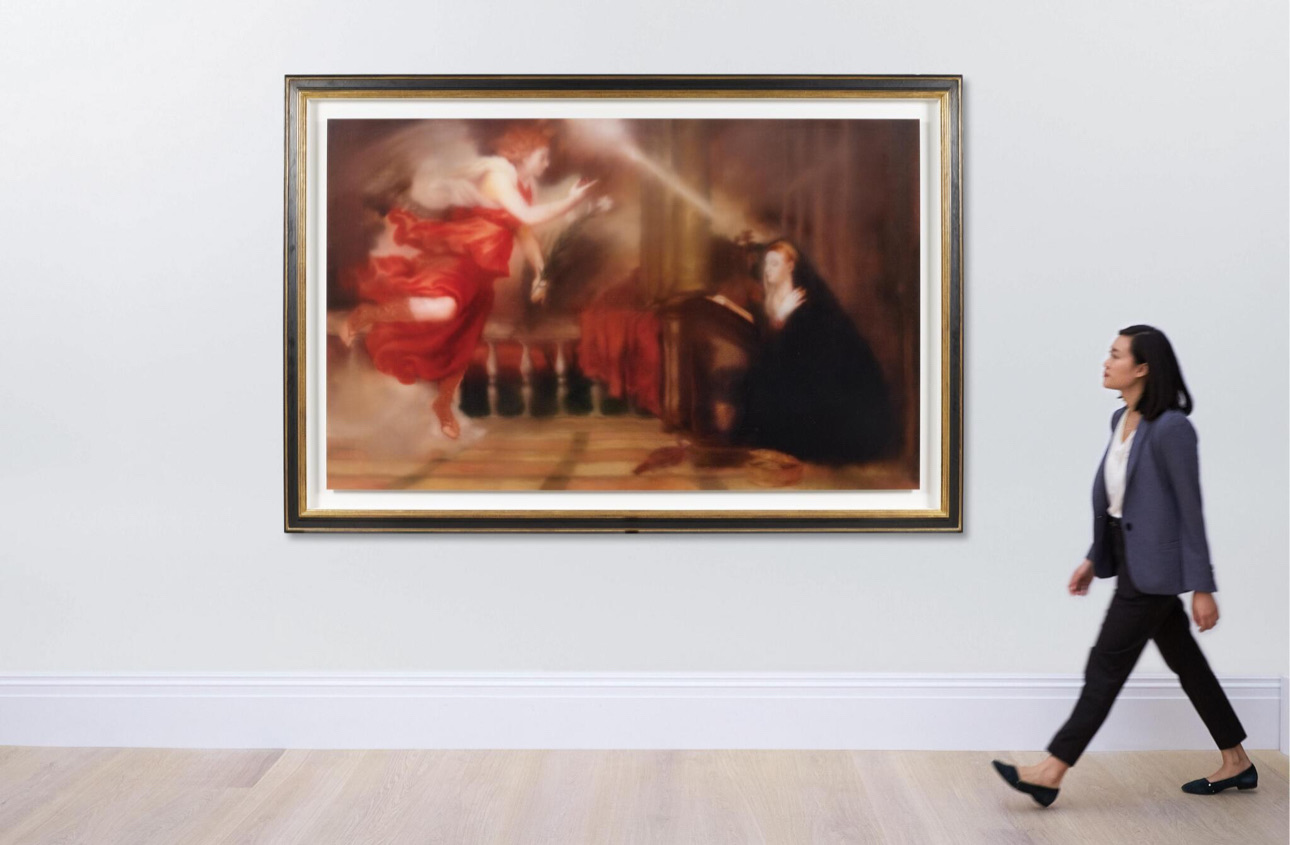 This monumental print by Gerhard Richter reinterprets Titian's 16th century masterpiece The Annunciation. Richter employs his signature blur effect, abstracting the original religious scene to explore the relationship between painting, photography, and historical memory. The work is a prime example of his photo painting technique, where a source image is rendered in a hazy, out of focus style. Numbered 36 from the edition of 50 and published by HENI London, this is a significant and collectible work from one of the most important living artists.