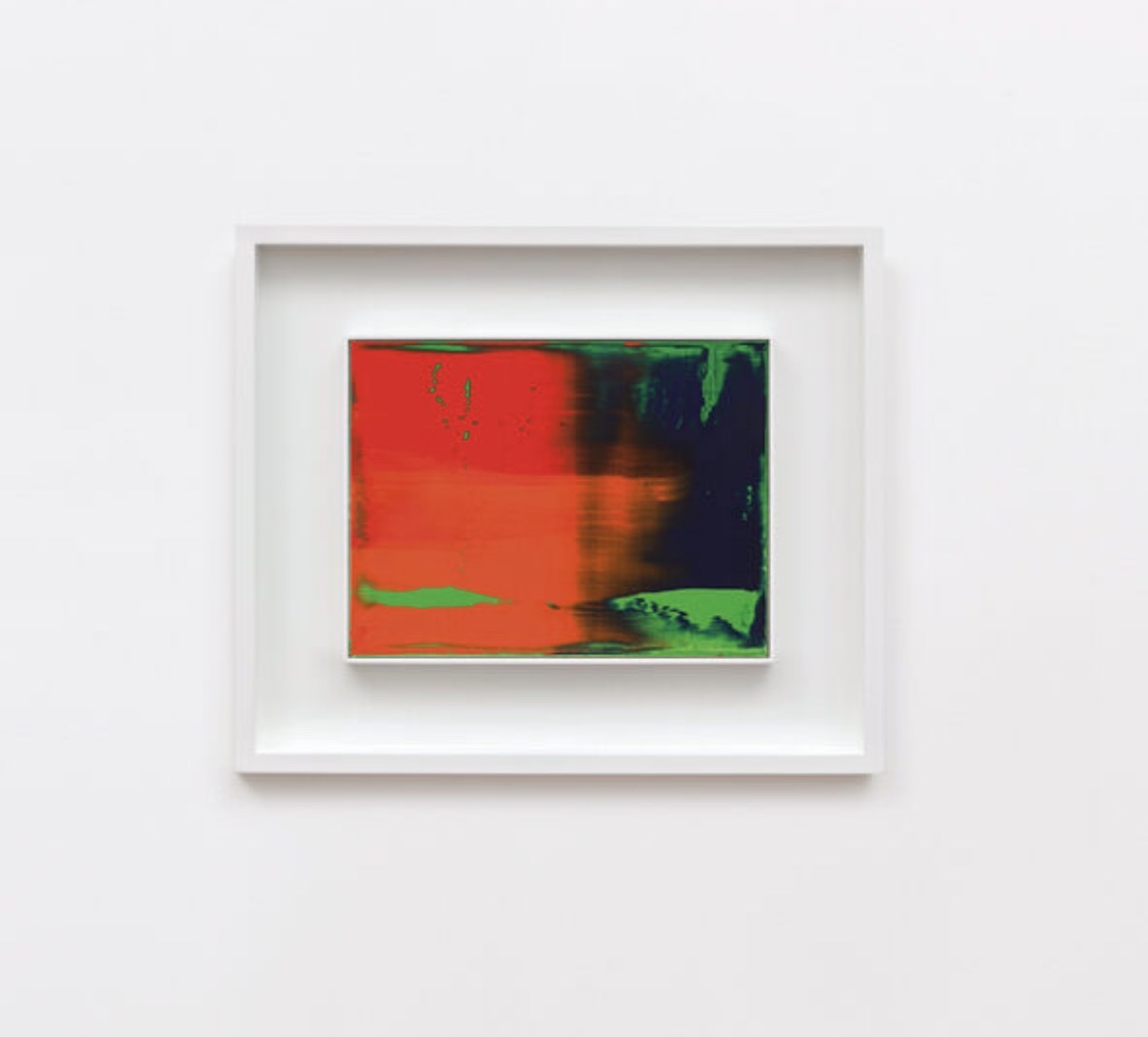 A vibrant abstract painting from Gerhard Richter's 'Grün - Blau - Rot' series, executed in his signature squeegee technique with bold fields of red, deep navy blue, and bright green dynamically layered and dragged across the canvas. The work demonstrates Richter's mastery of controlled accident, with gestural sweeps revealing underlying colour through scraped and smeared passages. Signed, dated, and numbered 'zu 789' by the artist, this is a unique work accompanied by a Certificate of Authenticity issued by Galerie Ludorff. Presented in a white float frame, it is currently on offer through Ludorff at TEFAF Maastricht 2026.
