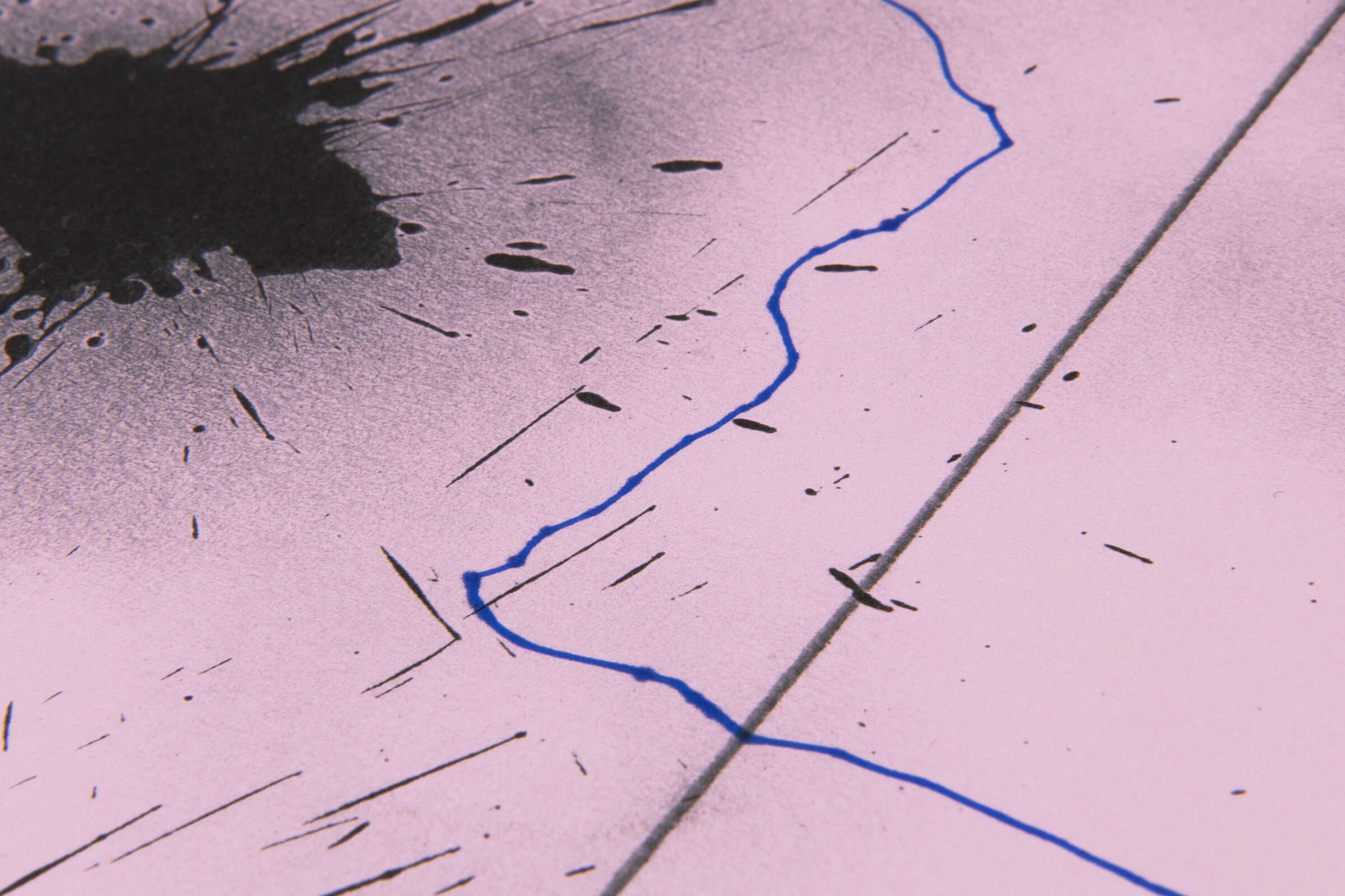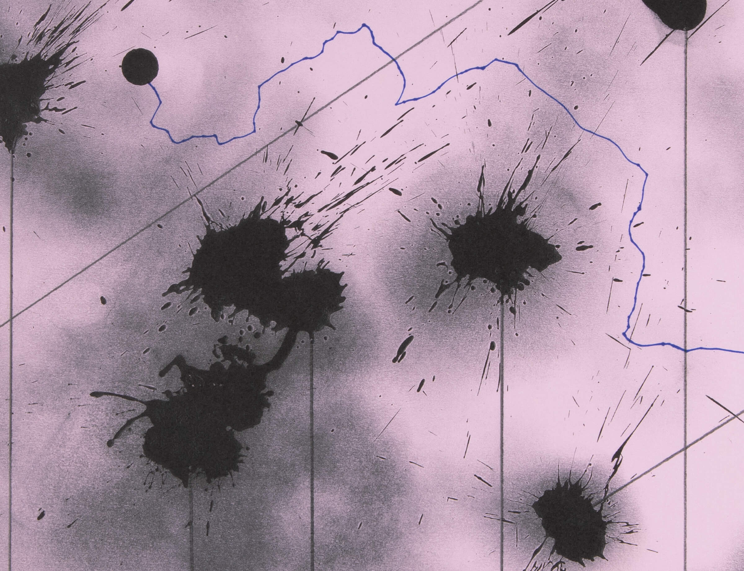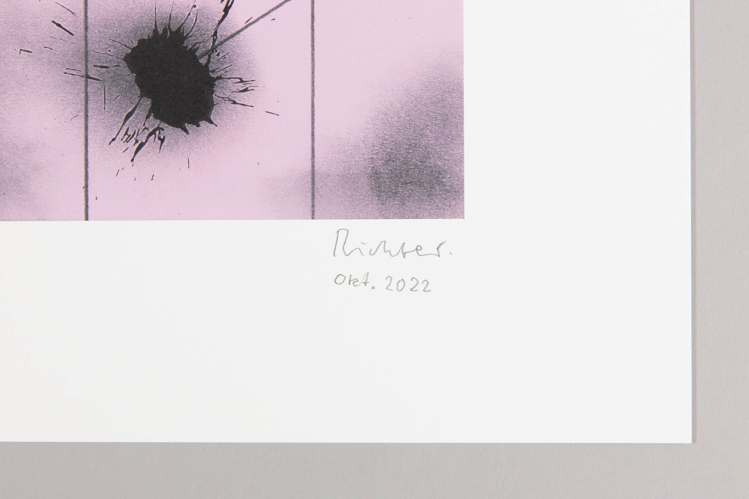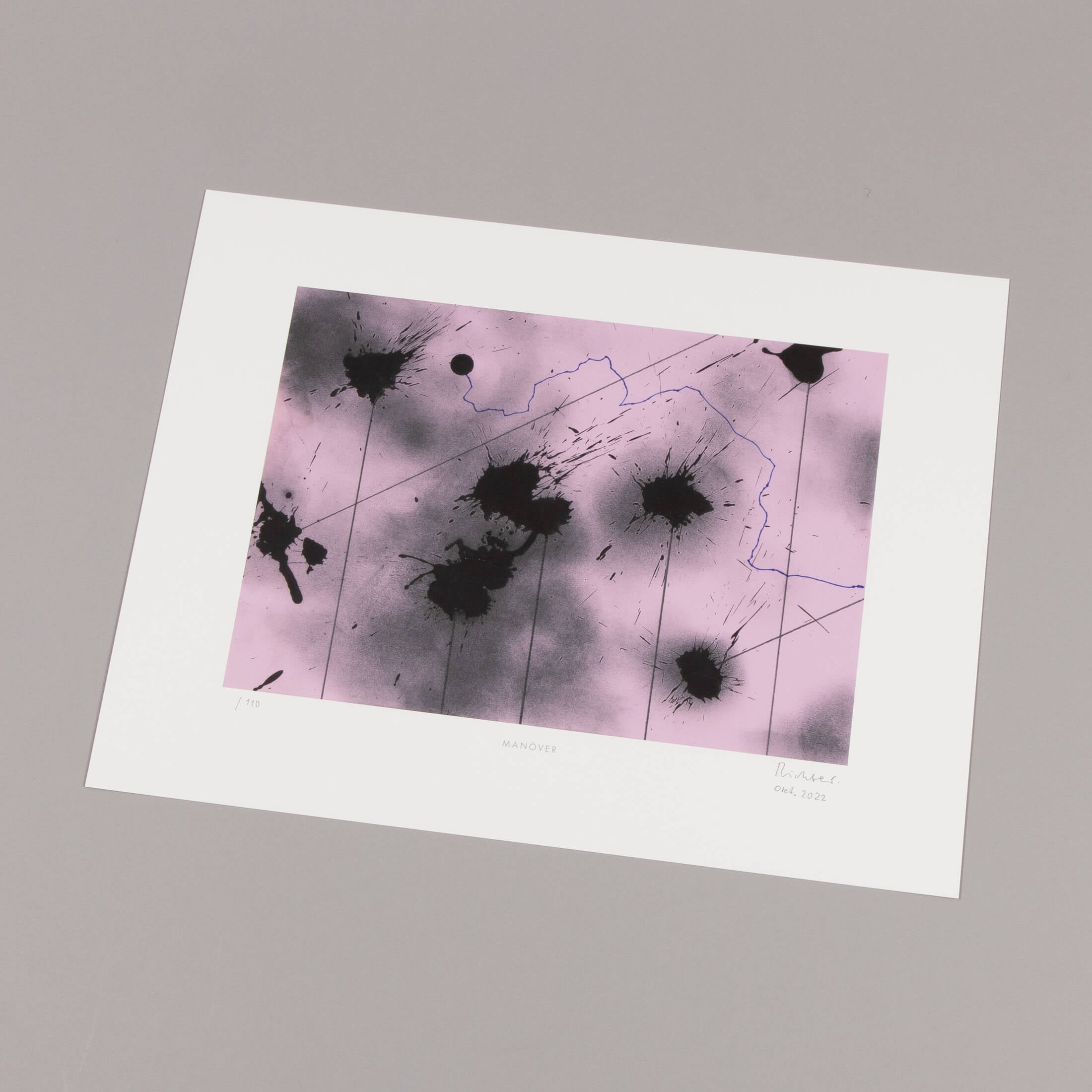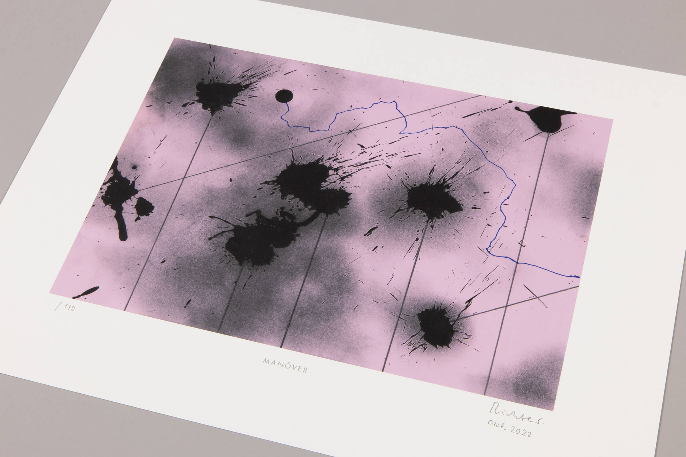 Manöver by Gerhard Richter is a signed unique edition from 2022, combining a digital print on paper with a hand-drawn felt-tip pen intervention. The composition features a soft pink ground structured by fine linear elements and disrupted by black, ink-like formations that dissolve into hazy, atmospheric zones. The defining element is the blue zigzag line drawn by Richter across the surface. Applied individually to each of the 110 impressions, this gesture transforms every work into a unique piece, merging mechanical reproduction with direct artistic intervention. The title Manöver introduces a subtle reference to themes of war and military action. The pink ground and smoky forms can be read as an abstracted sky marked by explosions and drifting clouds, aligning the work with Richter’s broader engagement with political imagery . Balancing system and spontaneity, Manöver encapsulates Gerhard Richter’s core visual language. Hand-signed, numbered, and dated, the artwork stands as a rare hybrid of print and original drawing within contemporary art.