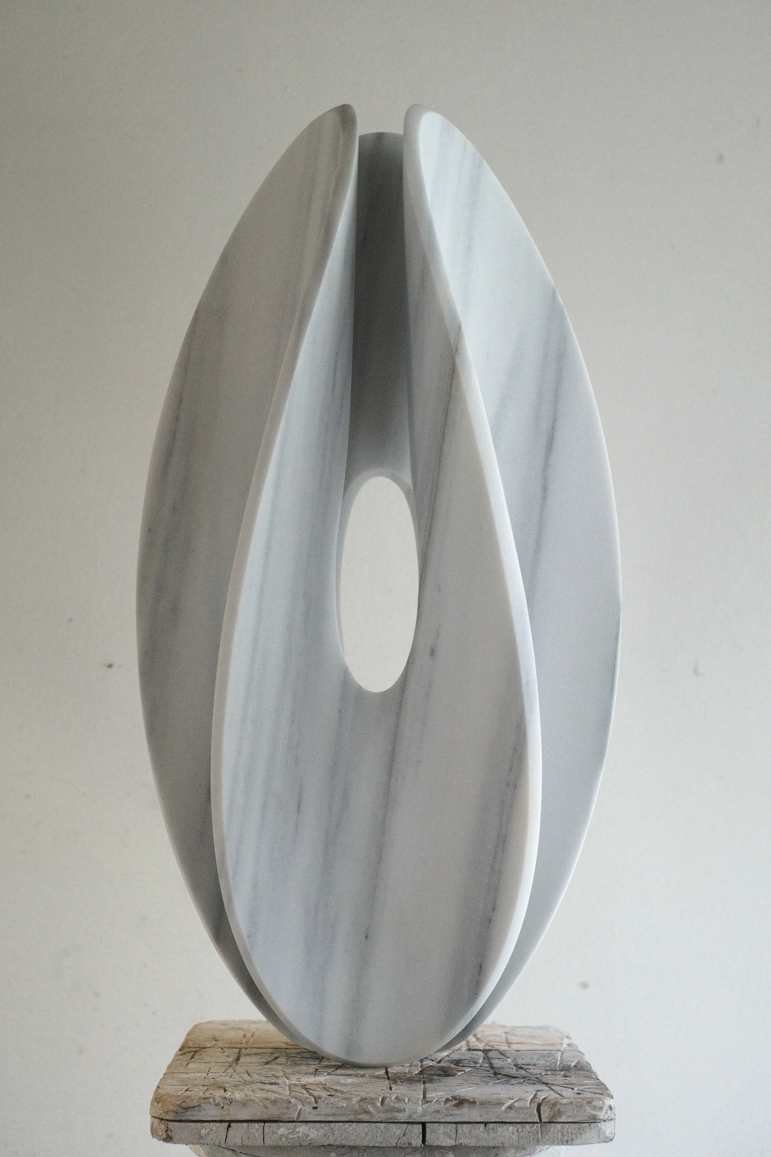 Carved from veined lasa marble, this sculpture reveals the artist's profound engagement with natural material and its inherent properties. The curved form emerges through the subtraction of stone, allowing the marble's veining patterns to guide and define the composition. The work captures a moment of metamorphosis, where the stone's geological history becomes visible through contemporary sculptural intervention. Light and shadow activate the marble's surface, creating a dynamic interplay across the curved planes. The sculpture demonstrates the artist's technical mastery and conceptual sensitivity to material authenticity.