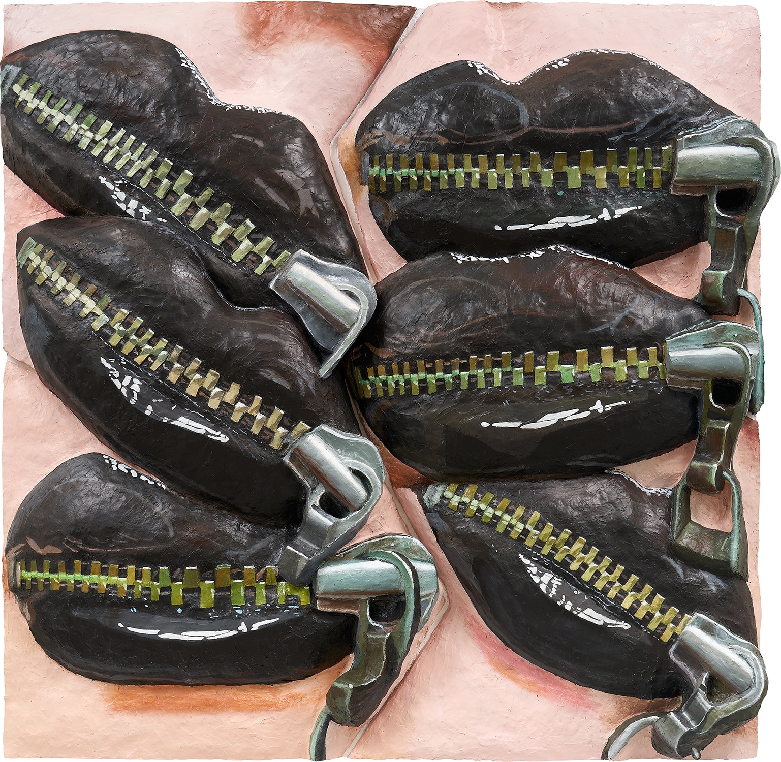 Gina Beavers' 'Zipper Lips' is created using acrylic and foam on panel in 2018. The work employs unconventional materials and mixed media techniques to create a striking composition.