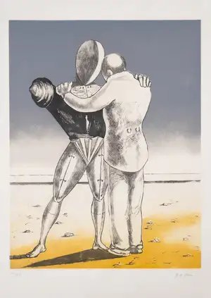 Giorgio de Chirico's "Il ritorno del figliol prodigo" (The Return of the Prodigal Son) from 1974 is a colored etching with aquatint that reimagines the biblical parable through the artist's characteristic metaphysical lens. Created as part of a limited edition of 30 and printed by renowned Roman printer Alberto Caprini, the work exemplifies de Chirico's continued engagement with classical themes and printmaking techniques later in his career. The composition combines the artist's distinctive use of architectural forms and spatial ambiguity to explore themes of homecoming and redemption.