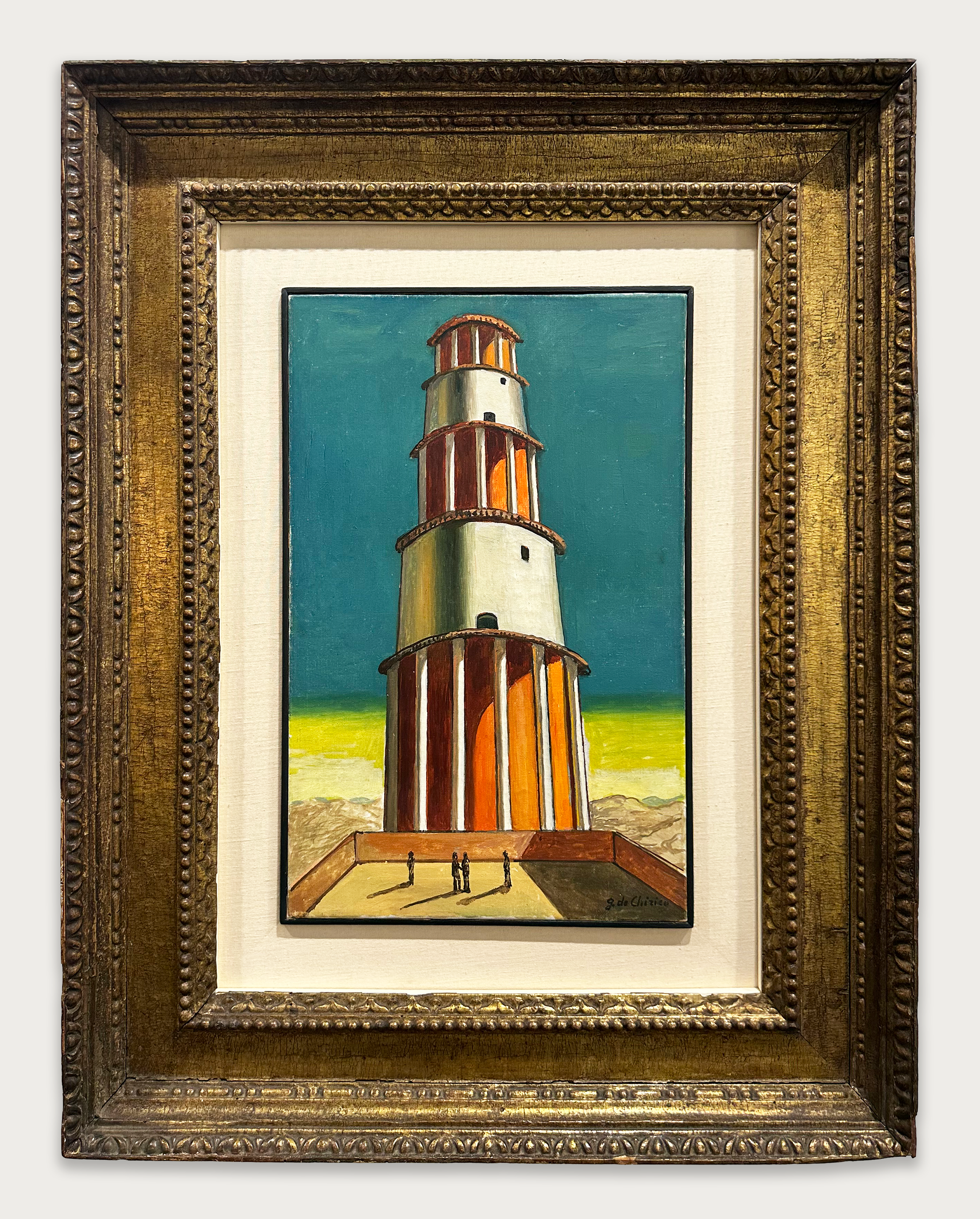 In this enigmatic composition, De Chirico presents a solitary tower dominating an austere landscape, rendered in his characteristic metaphysical style with sharp perspective and muted earth tones that evoke an unsettling sense of isolation and timelessness. The work exemplifies the artist's mature mastery of spatial ambiguity and psychological depth, where the monumental architecture becomes a meditation on absence, memory, and the enigmatic nature of urban form. Created in 1966, *La Torre* reflects De Chirico's enduring fascination with the symbolic power of architectural monuments and their ability to provoke contemplation and unease.