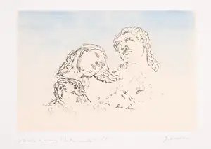Giorgio de Chirico's "Le tre sorelle" is a hand-coloured etching from 1972 that exemplifies the artist's continued engagement with classical and metaphysical themes in his later career. This artist's proof, inscribed as hand-coloured and printed by Alberto Caprini in Rome, demonstrates de Chirico's mastery of the printmaking medium and his characteristic use of muted, haunting palettes to convey enigmatic narratives. The substantial sheet size of approximately 50 by 70 centimetres allows the three sisters, rendered with the artist's distinctive stillness and compositional restraint, to command considerable presence on the paper.