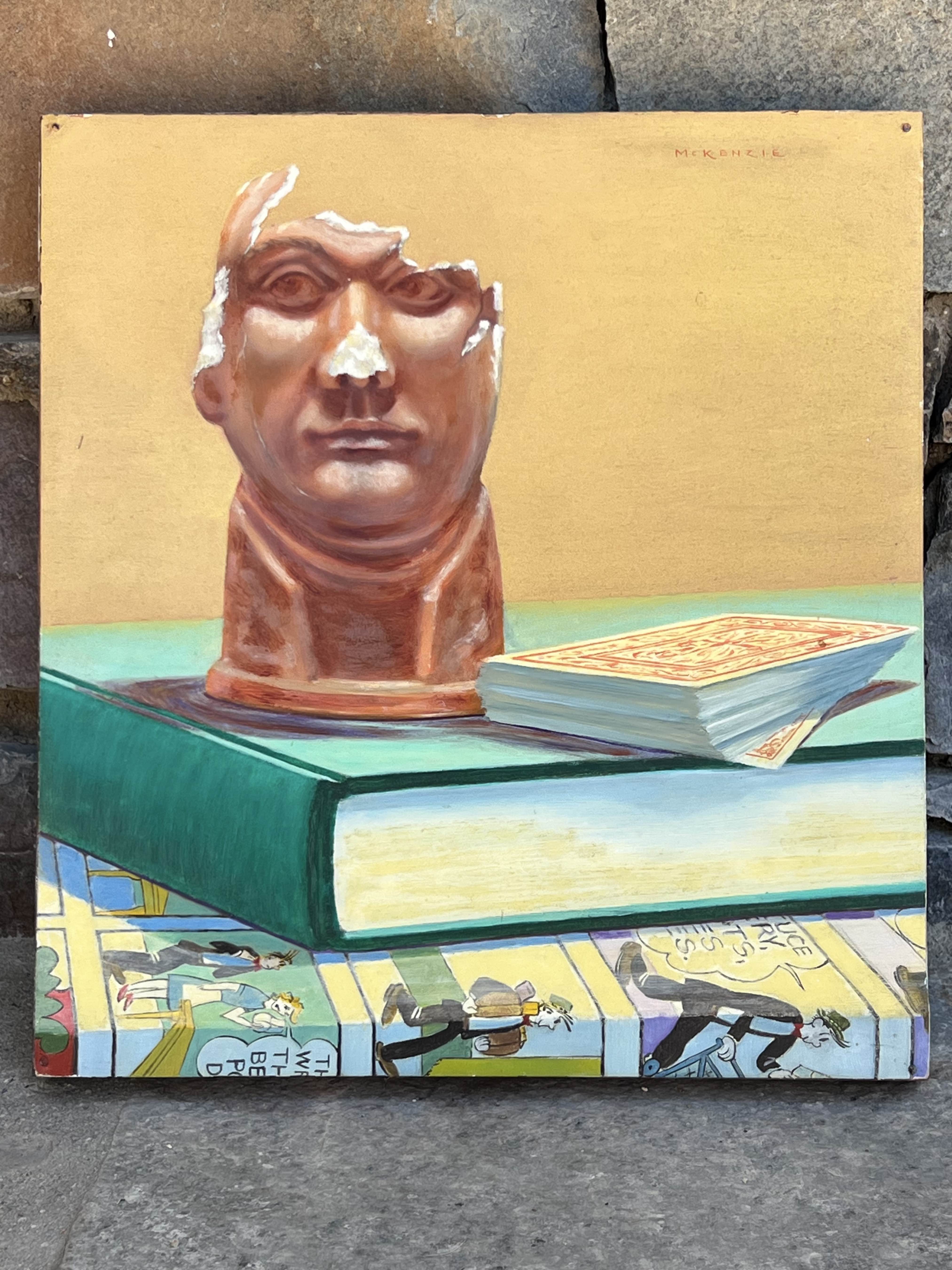 Still life with head sculpture, playing cards, book and Blondie comic strip
