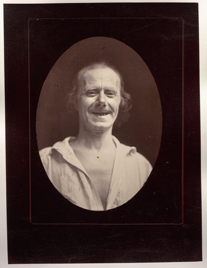 Capturing what Duchenne identified as genuine laughter through specific muscle contractions, this photograph became foundational to later studies of authentic versus forced facial expressions.