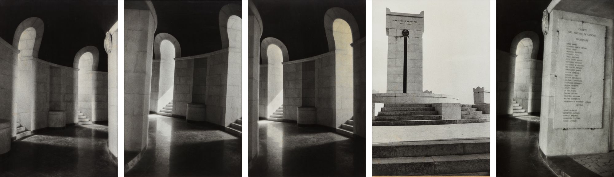 A series of five gelatin silver prints by Günther Förg capturing the architecture and atmosphere of Gardone, rendered in the artist's characteristically cool, contemplative black-and-white aesthetic. Förg's lens explores the interplay of light, shadow, and structure, reflecting his broader interest in Modernist architecture and its cultural resonance. The smooth photo paper lends the images a refined, precise quality that underscores the tension between documentary objectivity and artistic interpretation.