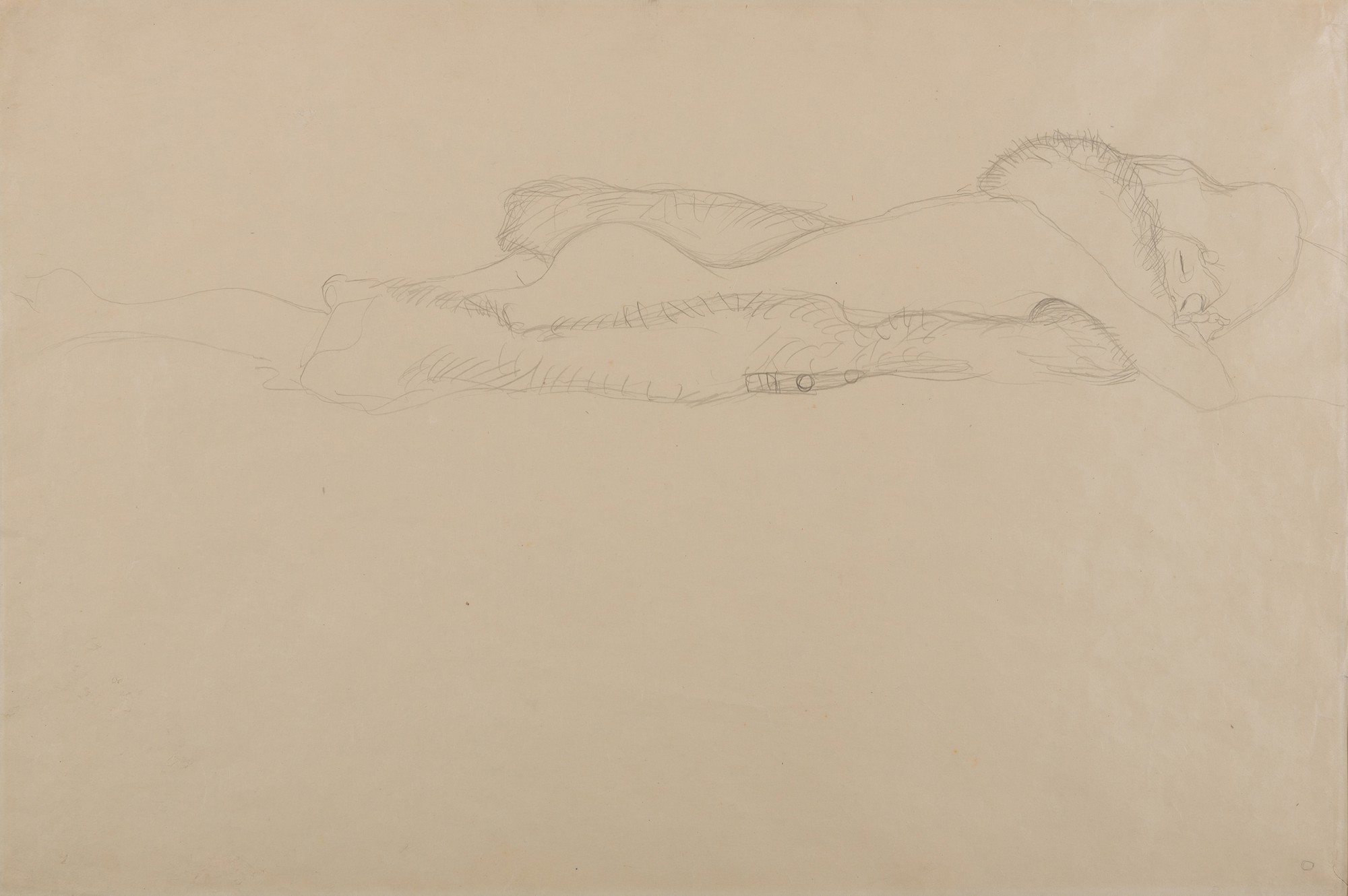 Gustav Klimt's 1904 pencil drawing Auf dem Bauch liegender Akt mit Pelzboa (Reclining Nude with Fur Boa) demonstrates the artist's mastery of figure drawing. This intimate study reveals Klimt's careful attention to the human form and drapery through confident pencil work. The drawing exemplifies the preparatory and independent study practices that parallel his more elaborate decorative works.