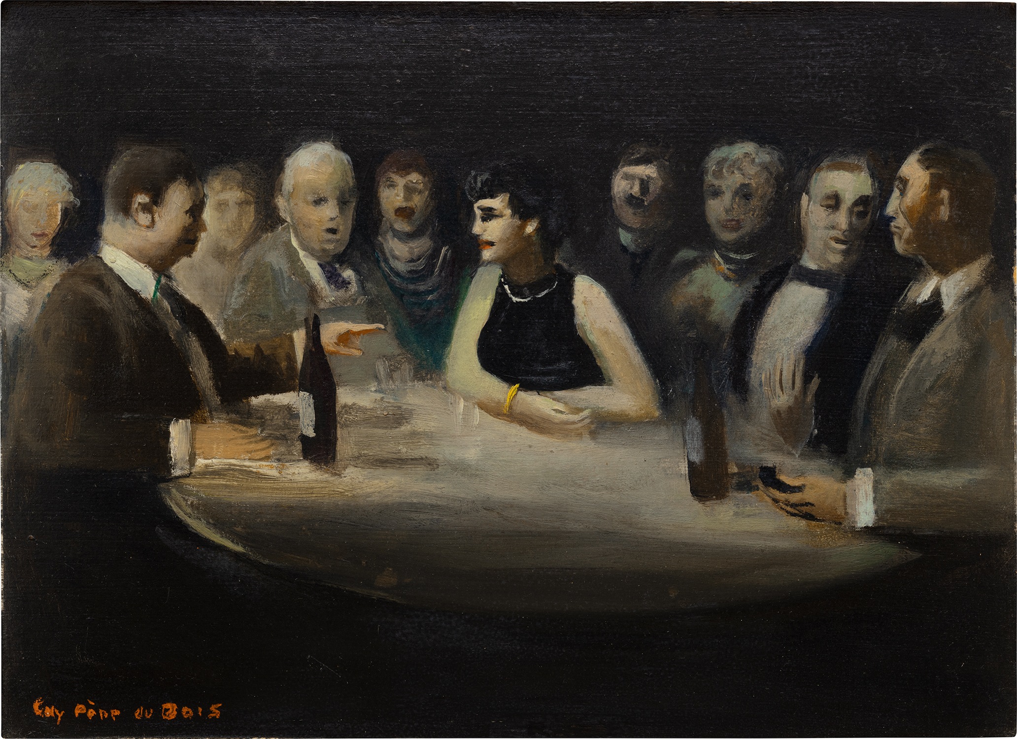 A intimate scene rendered in Guy Pène du Bois's characteristically bold, simplified forms, this oil on board depicts a Parisian café setting with his daughter Yvonne as the central figure. The work reflects du Bois's lifelong fascination with Parisian social life, capturing the quiet drama of human interaction with his signature muted palette and sculptural solidity. The composition embodies his distinctive blend of American realism and European modernism, distilling the essence of café culture into a moment of elegant, understated stillness.