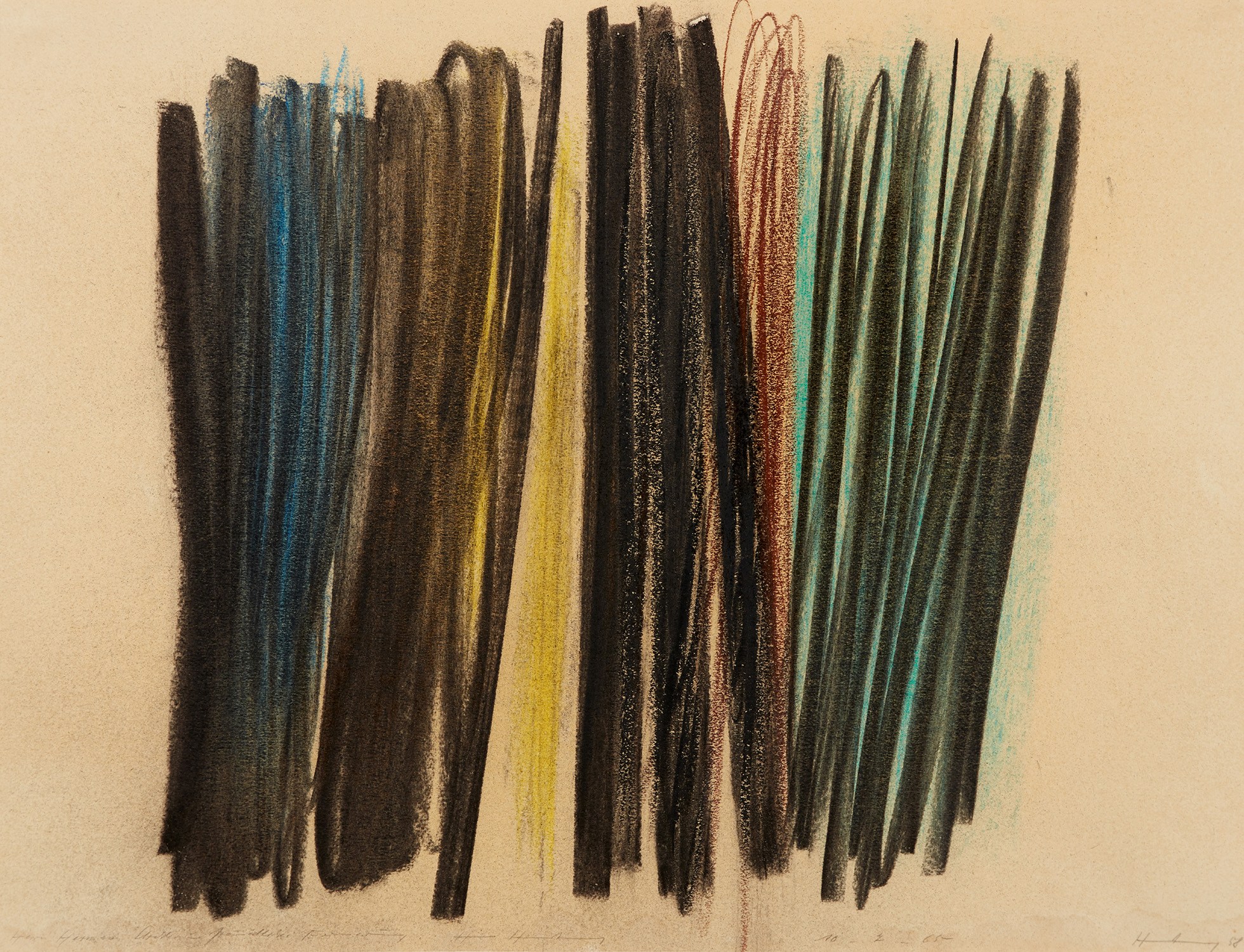 Hans Hartung's abstract work P1958-56 combines color chalk pastel and charcoal on wove paper, demonstrating his gestural and dynamic approach to abstraction. The layering of media creates a complex visual texture.