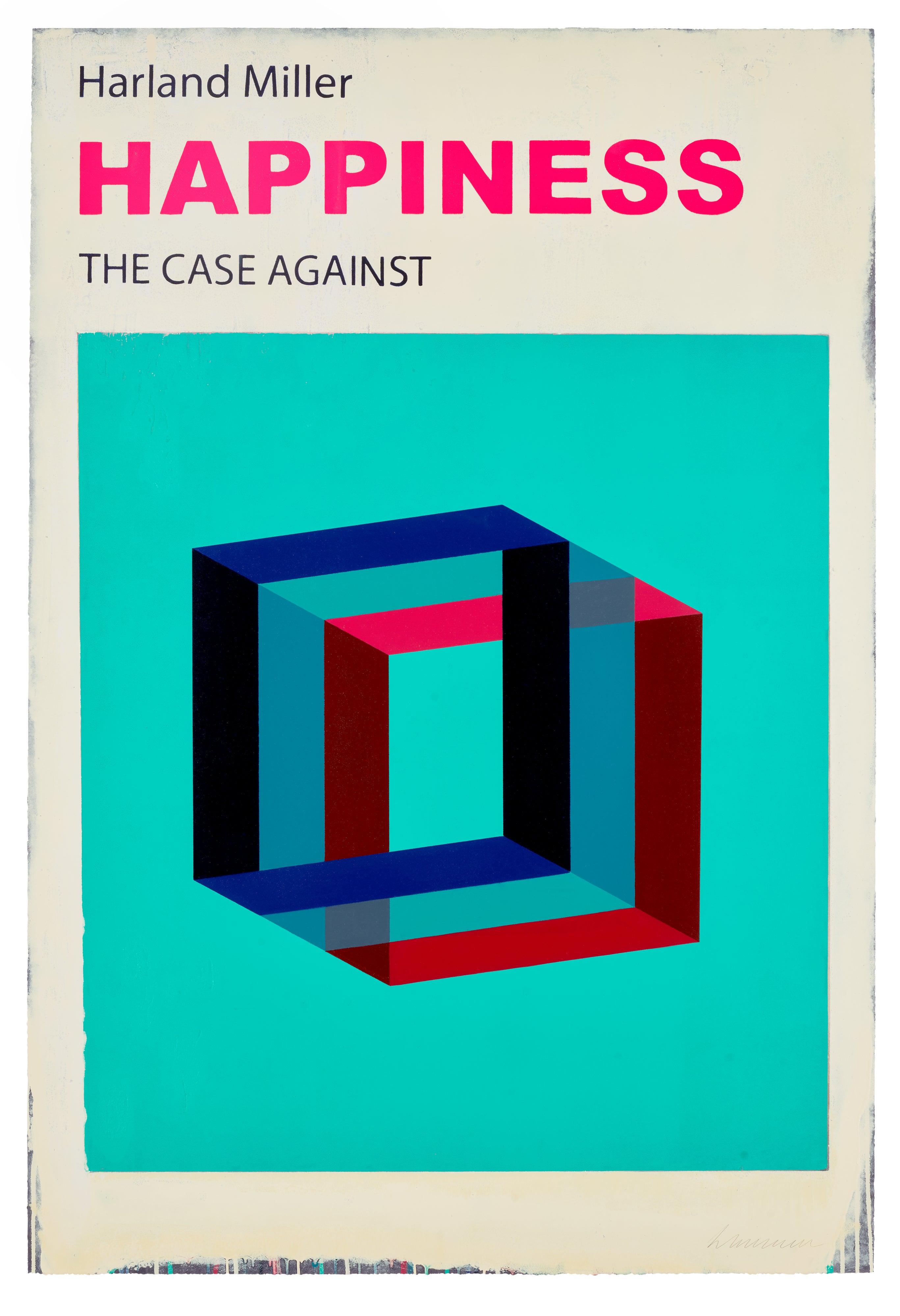 Harland Miller's *Happiness (Large)* draws on his signature style of reimagining oversized vintage Penguin paperback book covers, blending deadpan wit with an underlying emotional depth. The work's bold typography and muted, weathered palette evoke a sense of nostalgia while the ironic juxtaposition of the word "Happiness" invites reflection on the elusive and complex nature of the concept. Miller transforms the familiar into the contemplative, using the language of mass-market publishing to explore deeply personal and universal themes.