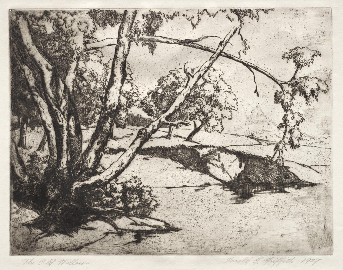 Part of the American printmaking revival of the early 20th century, this etching captures the romantic symbolism of the aging tree as a metaphor for endurance and the passage of time.