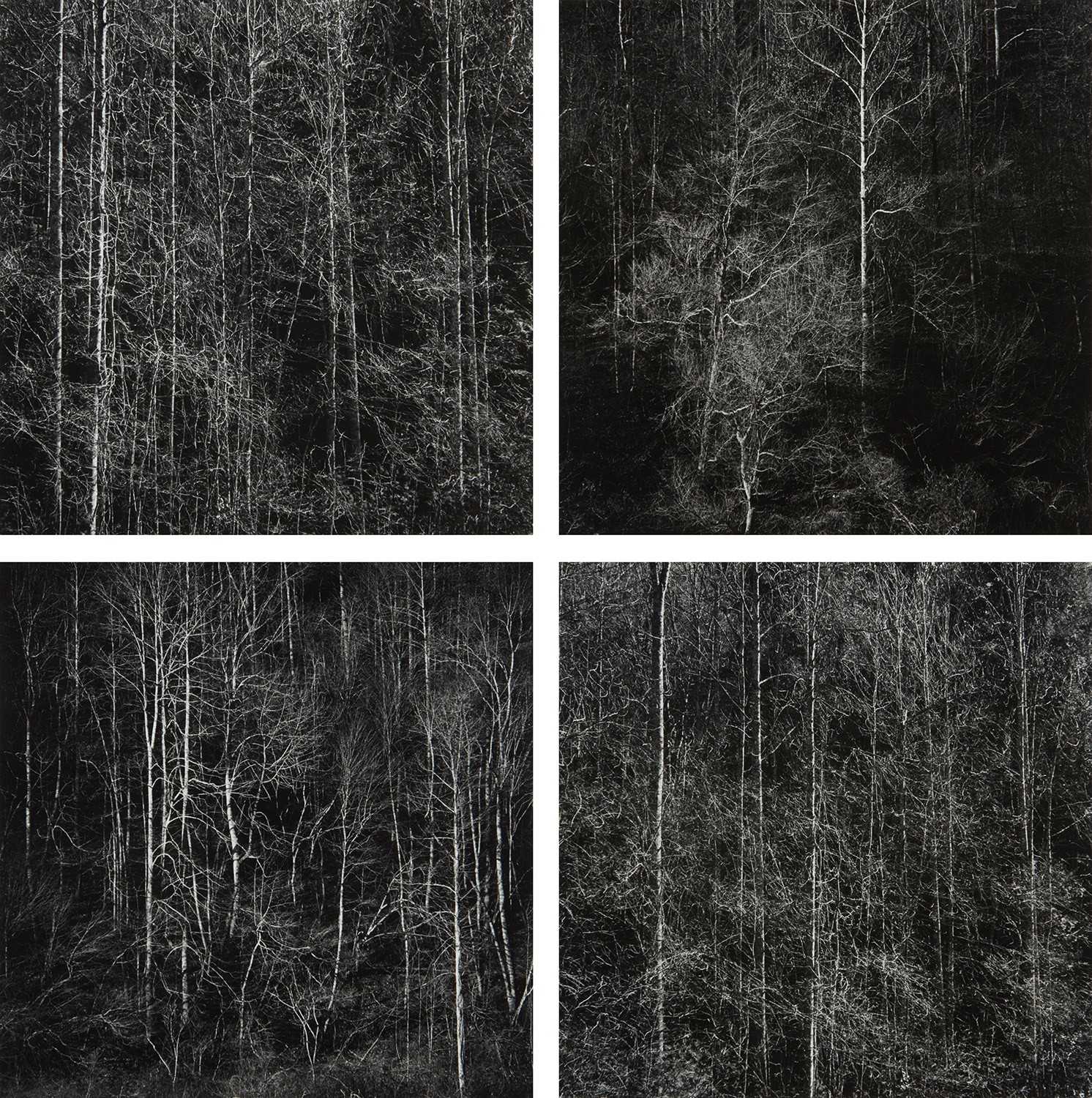Four gelatin silver prints capture the stark, quiet beauty of the Georgia Mountains in winter, rendered in Harry Callahan's signature minimalist aesthetic. Bare tree branches form intricate, web-like patterns against pale skies, their delicate lines etched with precision across the series of photographs. The sequence showcases Callahan's masterful use of light and shadow to distill the natural landscape into its most essential, abstract forms.