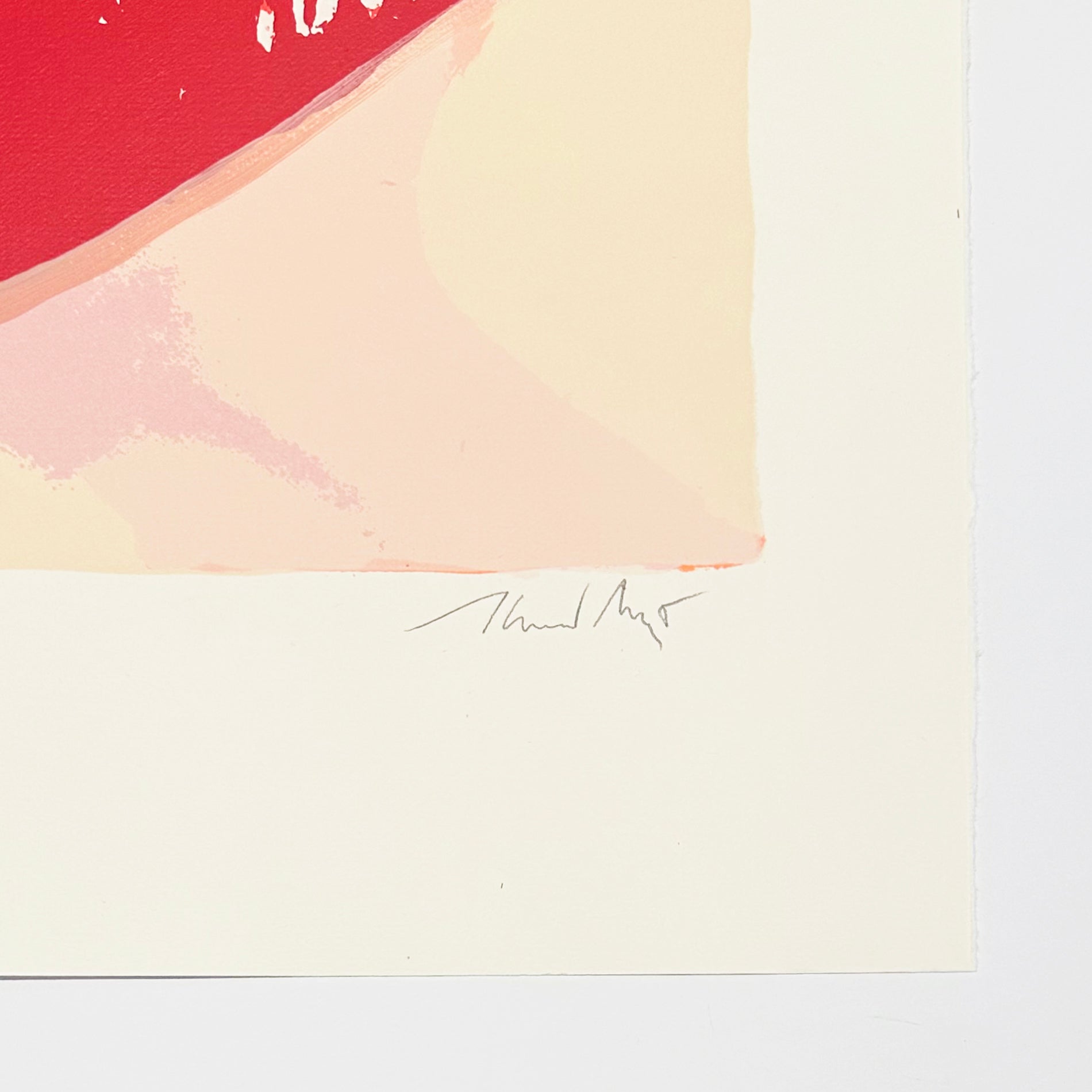 Red Kiss presents a striking composition where bold gestural marks in deep crimson dominate the composition against a luminous cream ground. Heiner Meyer's 2024 screenprint demonstrates his mastery of color saturation and layering, with the red forms suggesting both intimate abstraction and emotional immediacy. The handmade paper support enhances the work's tactile quality, while the careful framing preserves the subtle variations in tone and texture that emerge across the sheet. This is edition 33 of 35, making it a controlled yet accessible addition to a limited series. Meyer's practice consistently explores the tension between spontaneity and control inherent to the screenprinting process. Red Kiss exemplifies this dialogue through its energetic mark-making rendered with technical precision. The work commands attention through its chromatic intensity and compositional confidence, functioning equally well as a focal point in contemporary interiors or as part of a curated collection focused on contemporary printmaking. The substantial framed dimensions situate this piece as a significant statement rather than a peripheral gesture, rewarding sustained viewing with its complex play of surface and depth.