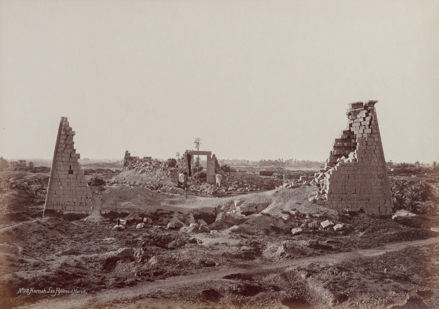 Early archaeological photography documents the monumental temple complex at Karnak, capturing ancient Egyptian architecture with the sharp detail possible through wet collodion process.