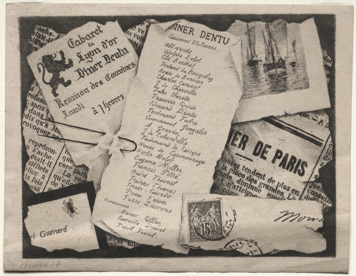 "Dinner Invitation" by Henri Charles Guérard is an etching and aquatint that exemplifies the artist's skill in printmaking during the late 19th century. The work demonstrates Guérard's characteristic attention to domestic interior scenes and social interactions, rendered with the delicate tonal variations characteristic of aquatint technique. As both a painter and printmaker, Guérard used the combination of etching's linear precision and aquatint's soft modeling to capture the nuanced atmosphere of an intimate social moment.