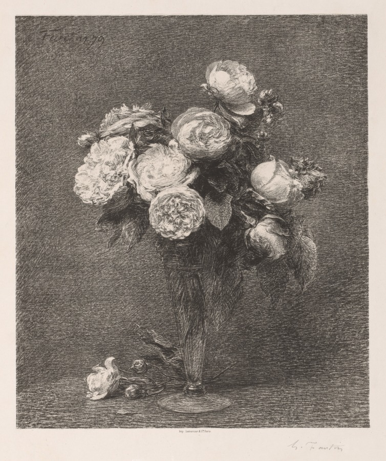 Departing from his usual figural subjects, the floral still life demonstrates Fantin-Latour's versatility in lithographic interpretation of his famous painted motifs. Delicate tonal variations capture the subtle beauty that made his flower paintings internationally celebrated.