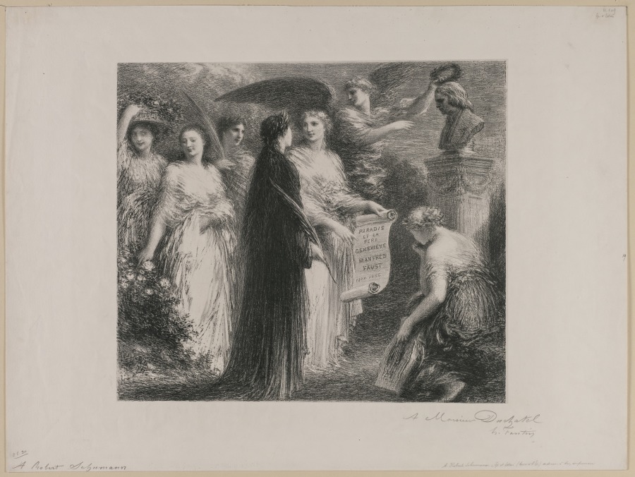 Musical devotion inspires this tribute lithograph that demonstrates Fantin-Latour's ability to visualize the emotional content of romantic composition.