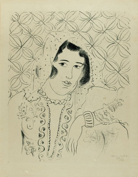 Bold contrasts between figure and decorative background explore Matisse's ongoing dialogue between representation and pattern, form and ornament.