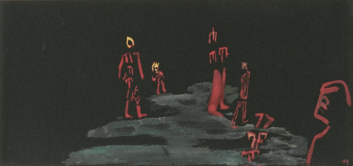 A dynamic composition of five red figures emerges against a stark black ground, their gestural forms rendered with Michaux's characteristic spontaneous energy. The gouache medium allows for bold, fluid marks that capture the essence of human presence rather than precise representation, hovering between abstraction and figuration. The vivid crimson of the figures pulsates with an almost visceral intensity against the deep darkness surrounding them.