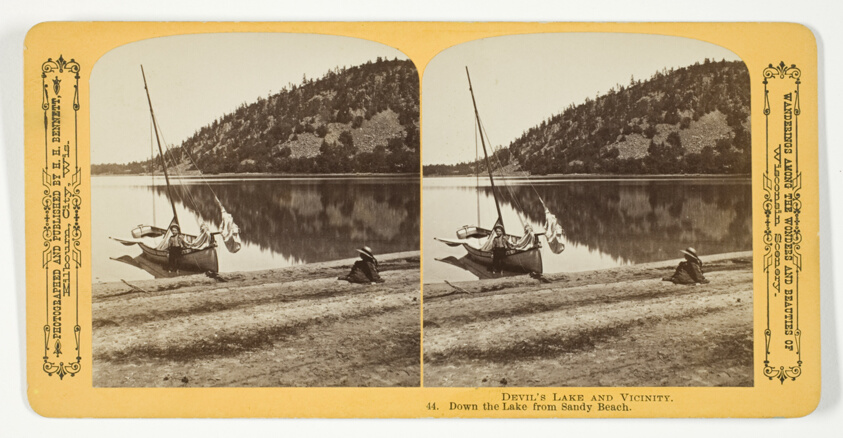 Devil's Lake's pristine waters reflect surrounding bluffs in this stereo view, showcasing Bennett's ability to capture Wisconsin's diverse geological landscapes.