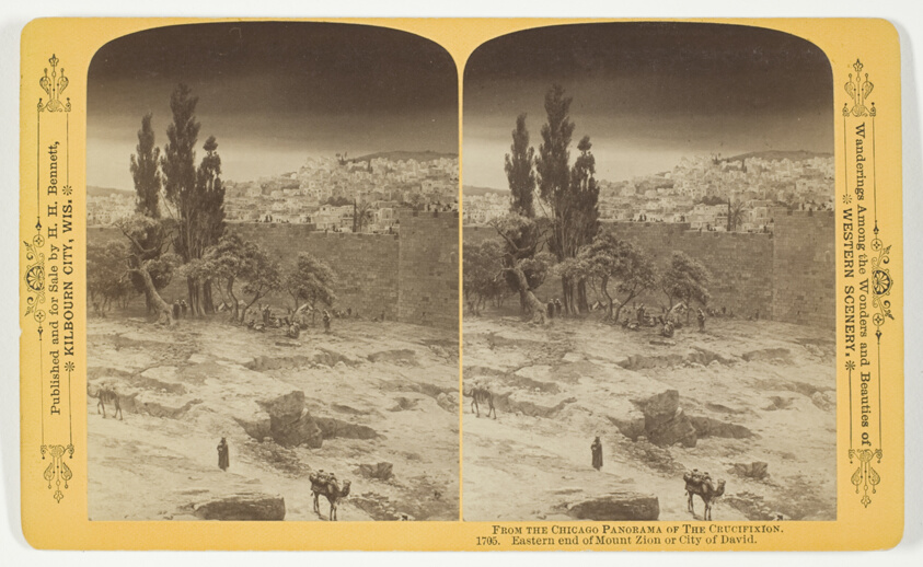Bennett's stereo photography documents the meticulous historical recreation of ancient Jerusalem's topography for Chicago audiences. The albumen print preserves the ambitious scale of these educational entertainments that brought distant biblical lands into vivid, three-dimensional reality.