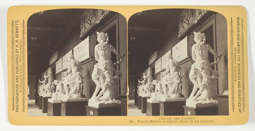Documenting the Art Institute's early galleries, Bennett's stereo photograph reveals how Chicago positioned itself as a cultural center through classical sculpture collections. The albumen print preserves the museum's formative years when it established its reputation for European artistic treasures.