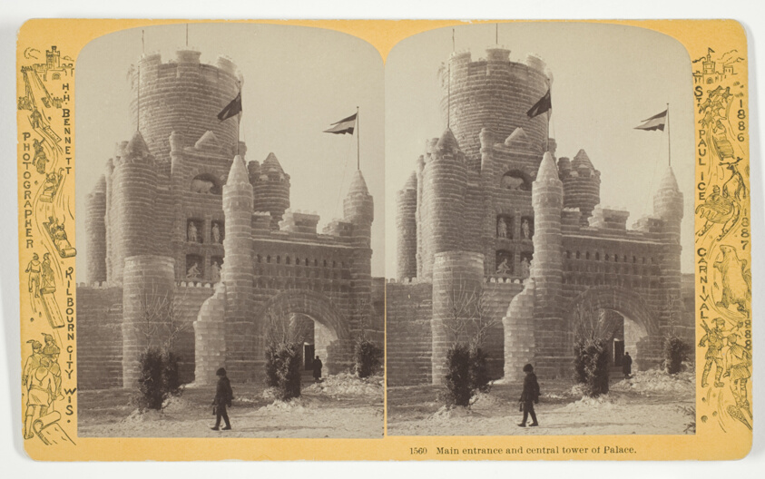 Architectural grandeur built from ice and snow demonstrates the ambitious scale of late 19th-century winter festivals, preserved in Bennett's precise stereoscopic detail.
