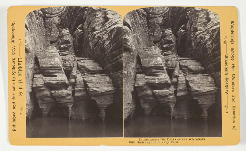 Carved by water over millennia, these natural stone steps showcase the geological processes that created the Dells, presented through Bennett's methodical stereoscopic documentation.