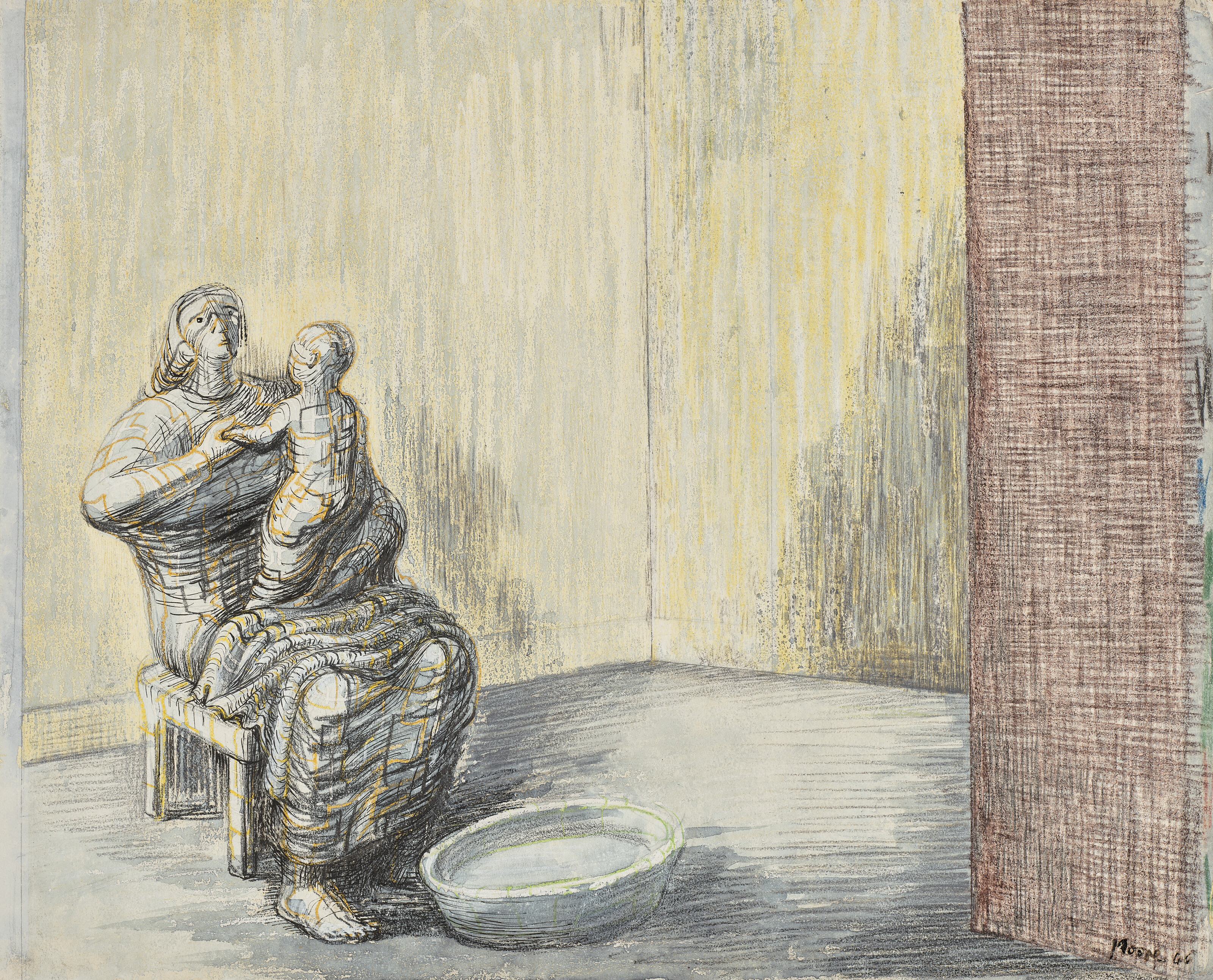 Henry Moore's "Mother Preparing Child for Bath" exemplifies the sculptor's characteristic exploration of the maternal form through organic, abstracted shapes that emphasize volume and protective gesture. The work demonstrates Moore's interest in the relationship between solid and void, with the mother's body creating a sheltering presence around the child through curved, interlocking forms. This piece reflects Moore's broader humanist concerns and his ability to convey tender domestic moments through modernist sculptural language.