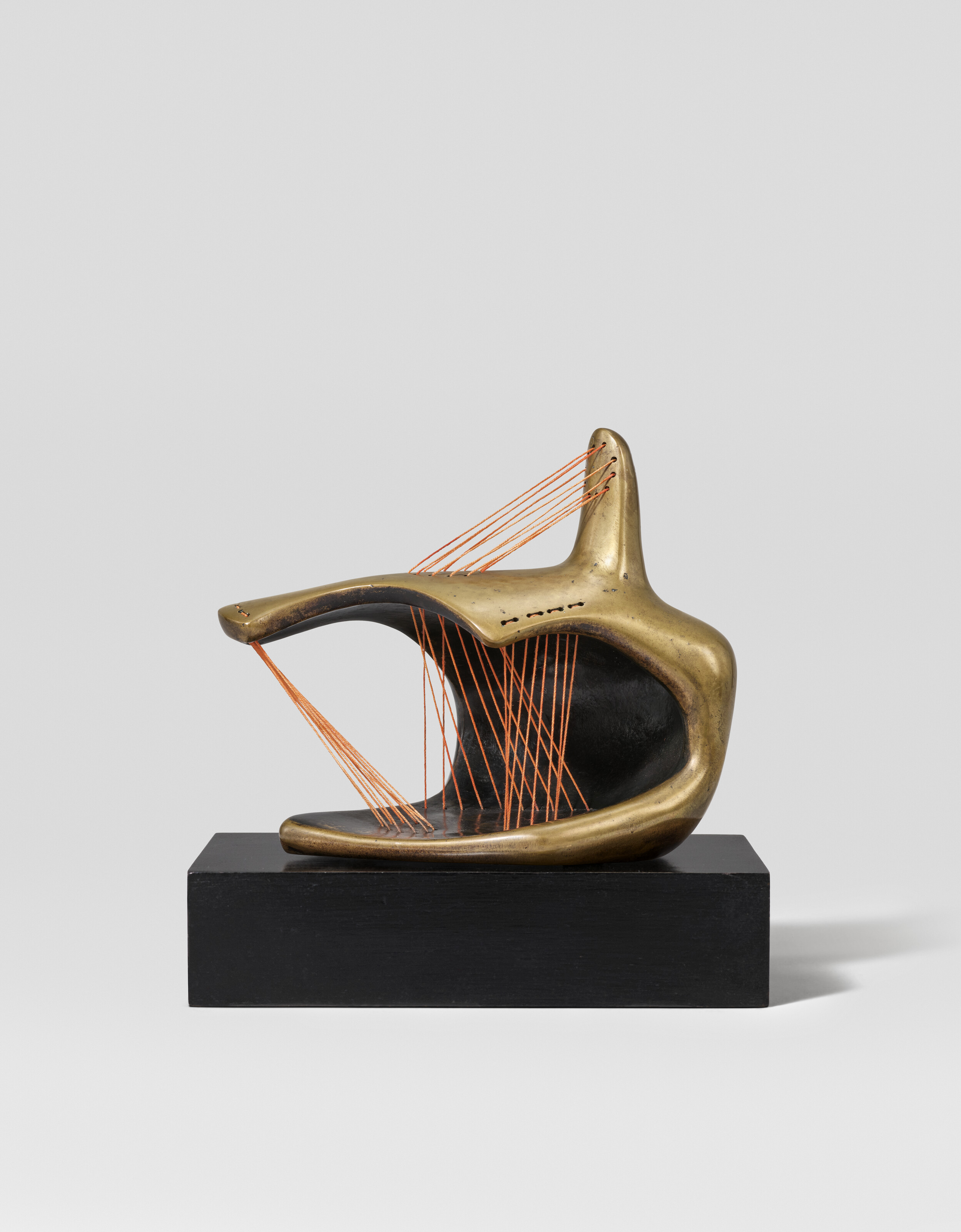 "Stringed Figure" (1946) exemplifies Henry Moore's exploration of abstract form and spatial relationships through the combination of bronze and taut string. The work demonstrates Moore's interest in how linear elements can define and activate three dimensional space, creating a dialogue between solid and void. This piece reflects the sculptor's broader practice of investigating organic abstraction and the interplay between mass and openness that characterized much of his postwar work.