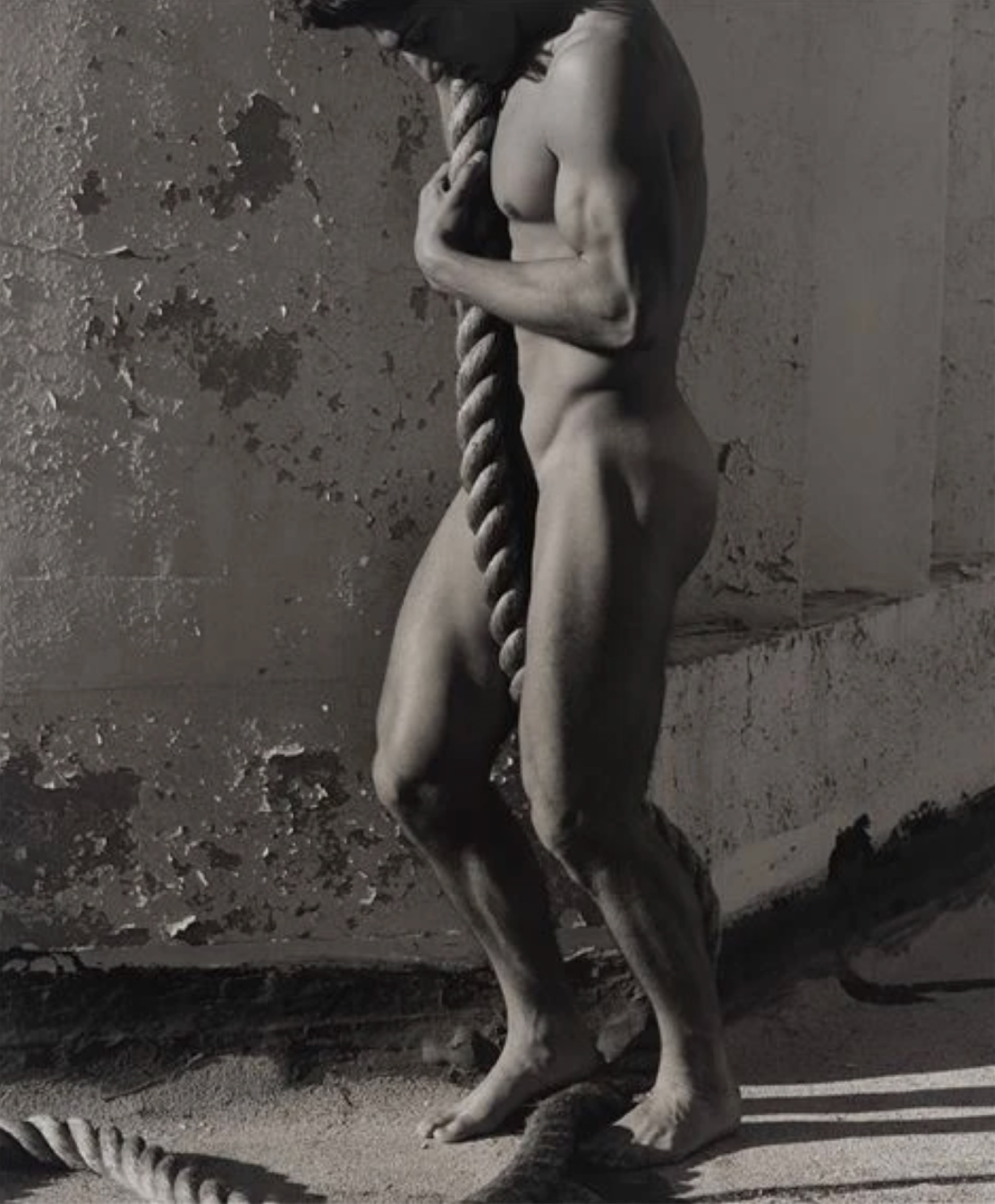 Tony with Rope is a quintessential example of Herb Ritts's celebrated male nudes. The photograph showcases a powerful, athletic figure whose form is sculpted by dramatic natural light, evoking the aesthetics of classical Greek and Roman sculpture. Ritts masterfully contrasts the smooth texture of the subject's skin with the rough rope and the weathered wall, creating a timeless and iconic image.