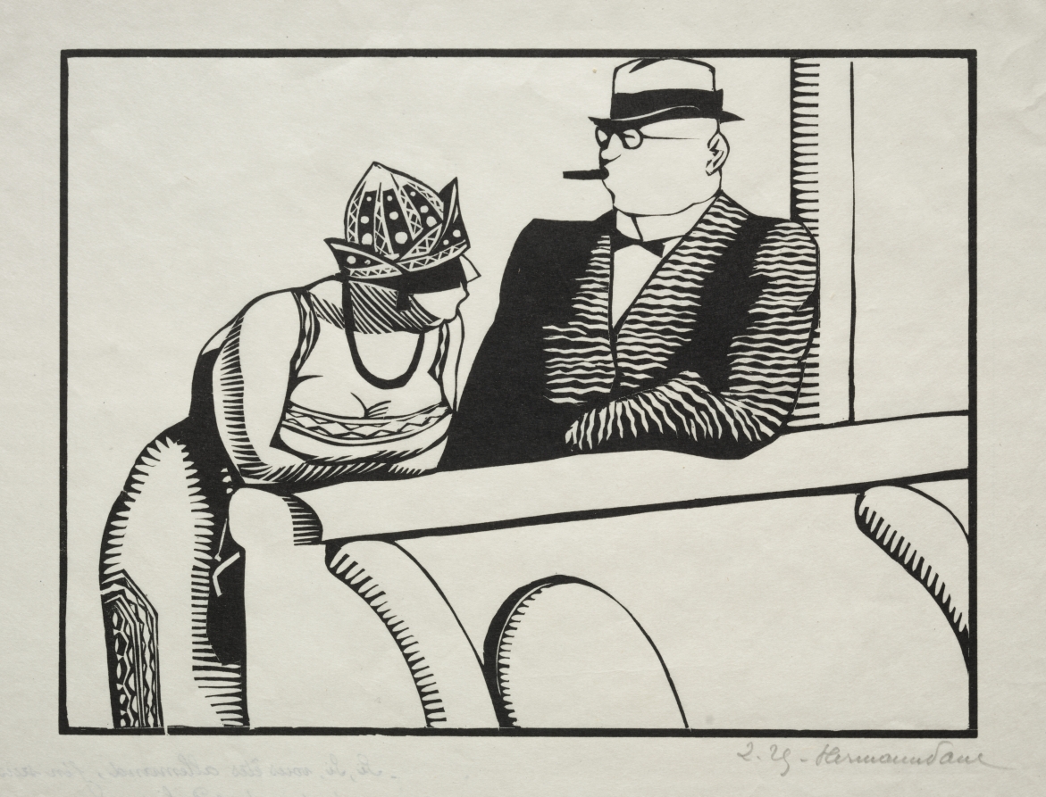 Wartime xenophobia and mistaken identity provide the theme for clean, expressive woodcut techniques that emphasize psychological tension.