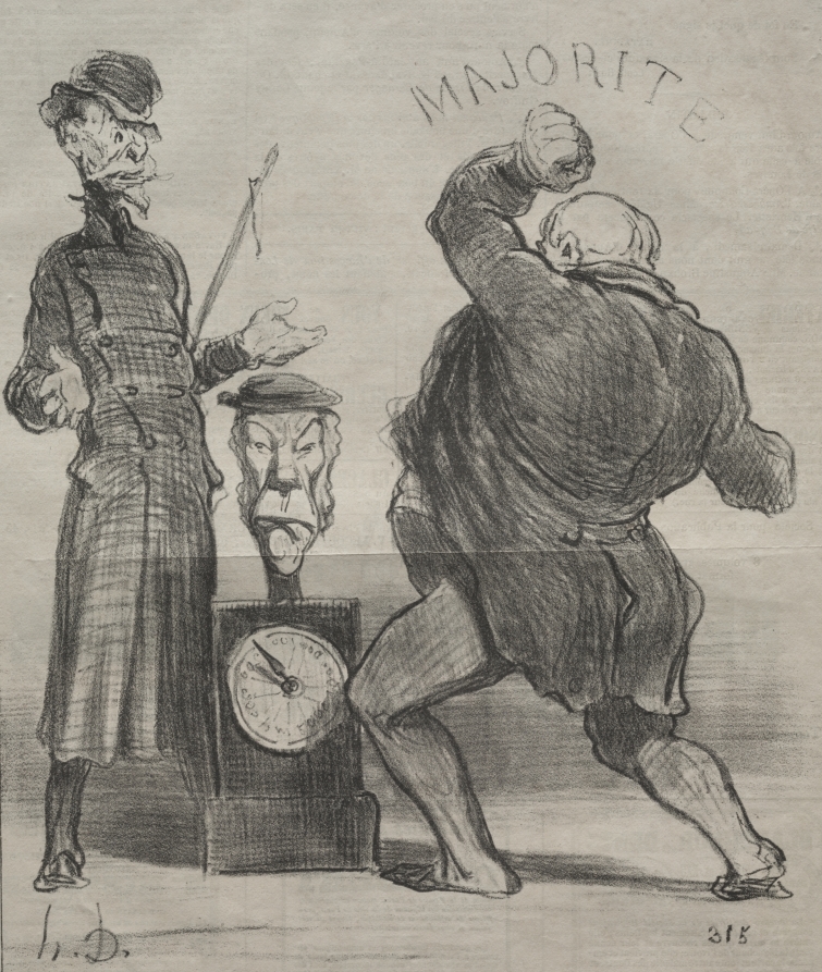 Physical comedy meets social observation as Daumier explores themes of masculinity and self-deception with his characteristic satirical edge.
