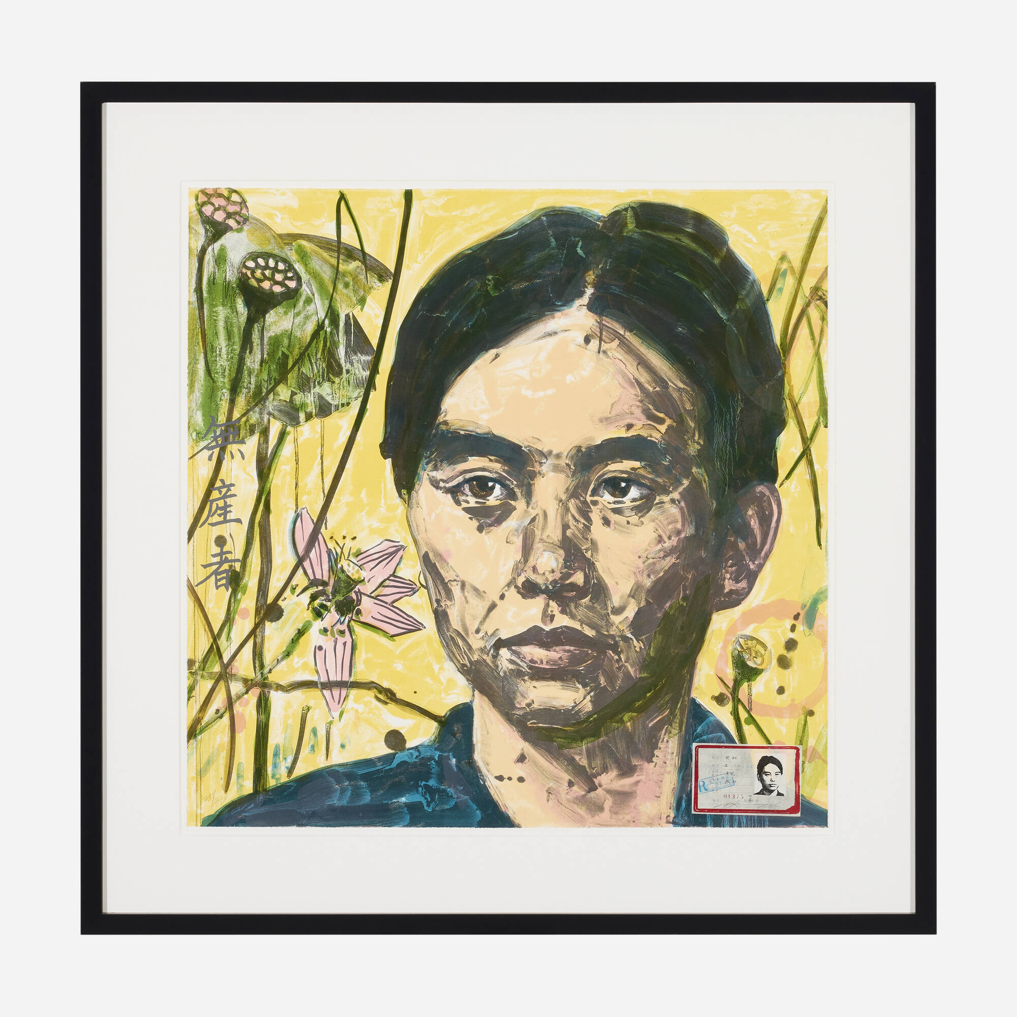Hung Liu's Proletarian from the Official Portraits series combines lithographic printing with collage techniques on fine art paper. The work engages with themes of labor, identity, and the representation of working people within official visual culture. By integrating cut paper elements with printed imagery, Liu creates a layered exploration of how individuals are portrayed and categorized in society. The mixed media approach adds depth and texture to questions about class and representation.