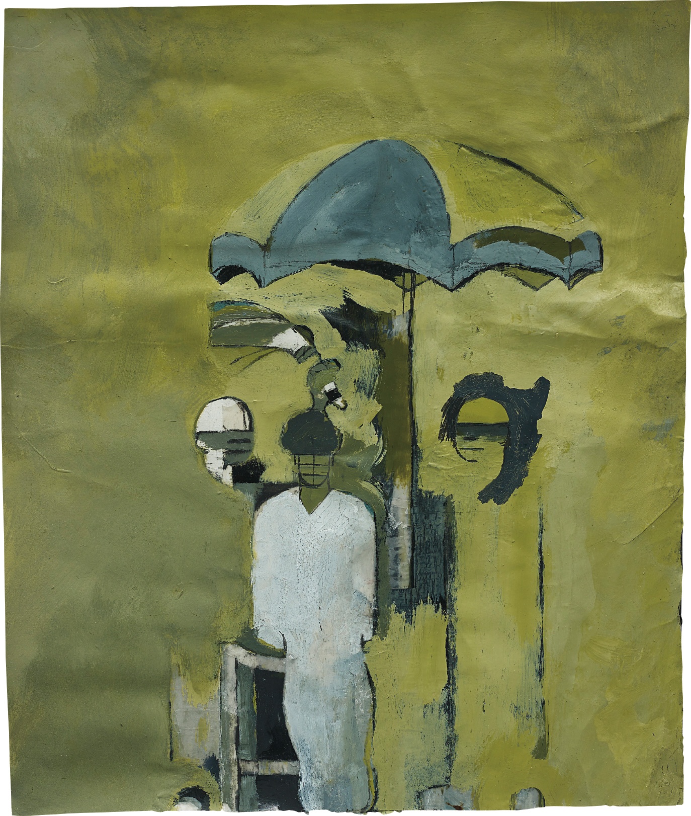 A lush, verdant scene rendered in oil, pencil, and glassine collage on paper, in which a green umbrella becomes a focal point amid Anderson's characteristically layered exploration of leisure, memory, and belonging. The translucent quality of the glassine collage adds depth and a dreamlike ambiguity to the composition, evoking a sense of looking through time or water. Anderson's signature interest in the quieter, often overlooked moments of Black social life and recreational spaces resonates throughout the work.
