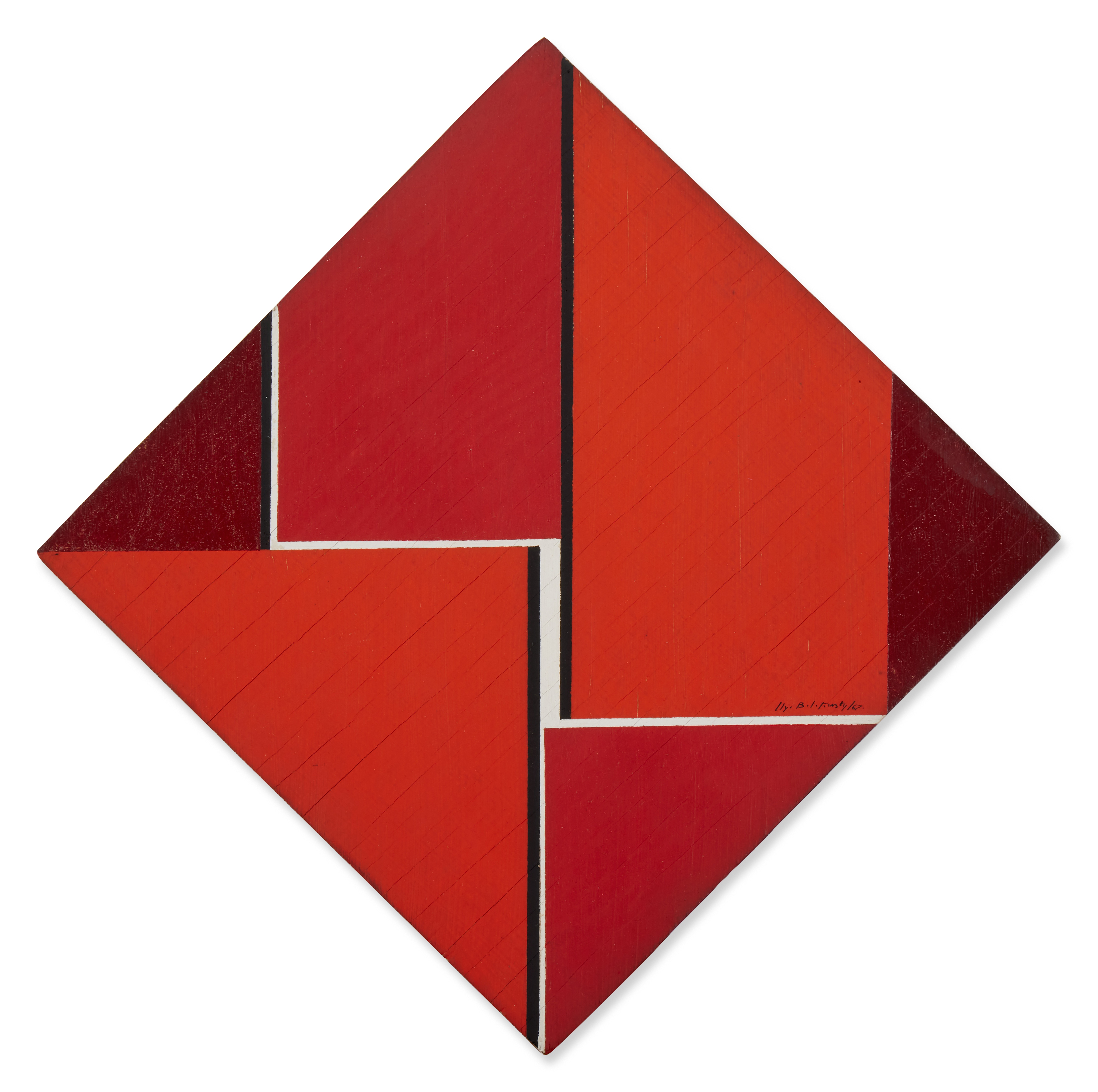 Ilya Bolotowsky's Red Diamond is an abstract geometric work created in acrylic on wood in 1967. The bold red diamond form represents the artist's commitment to pure abstraction and modernist principles.