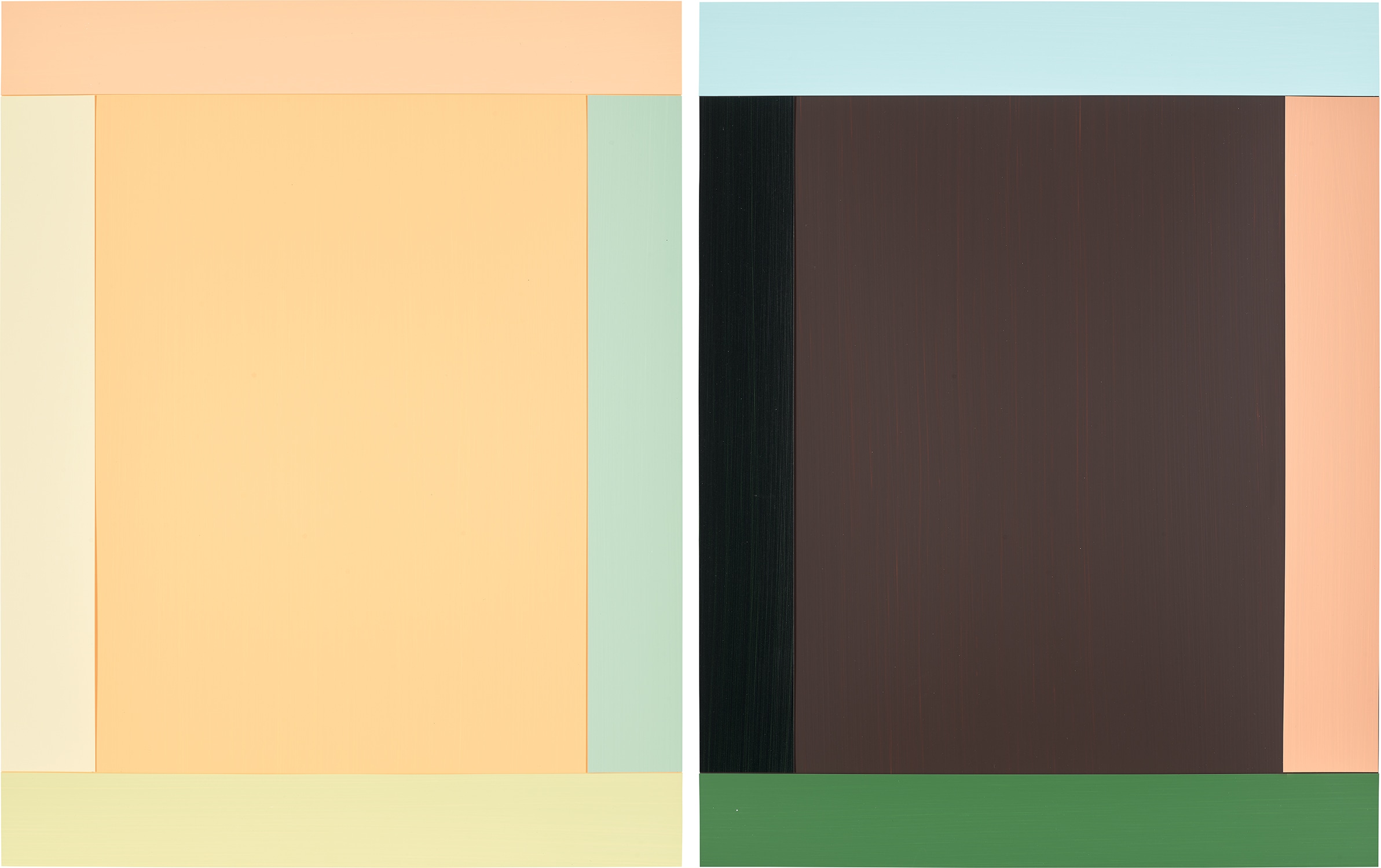 Knoebel creates a complex mixed-media work consisting of two collages combining acrylic paint with constructed and collaged plastic panels mounted on Alu-Dibond. The piece exemplifies contemporary abstraction through layered materials and chromatic relationships.