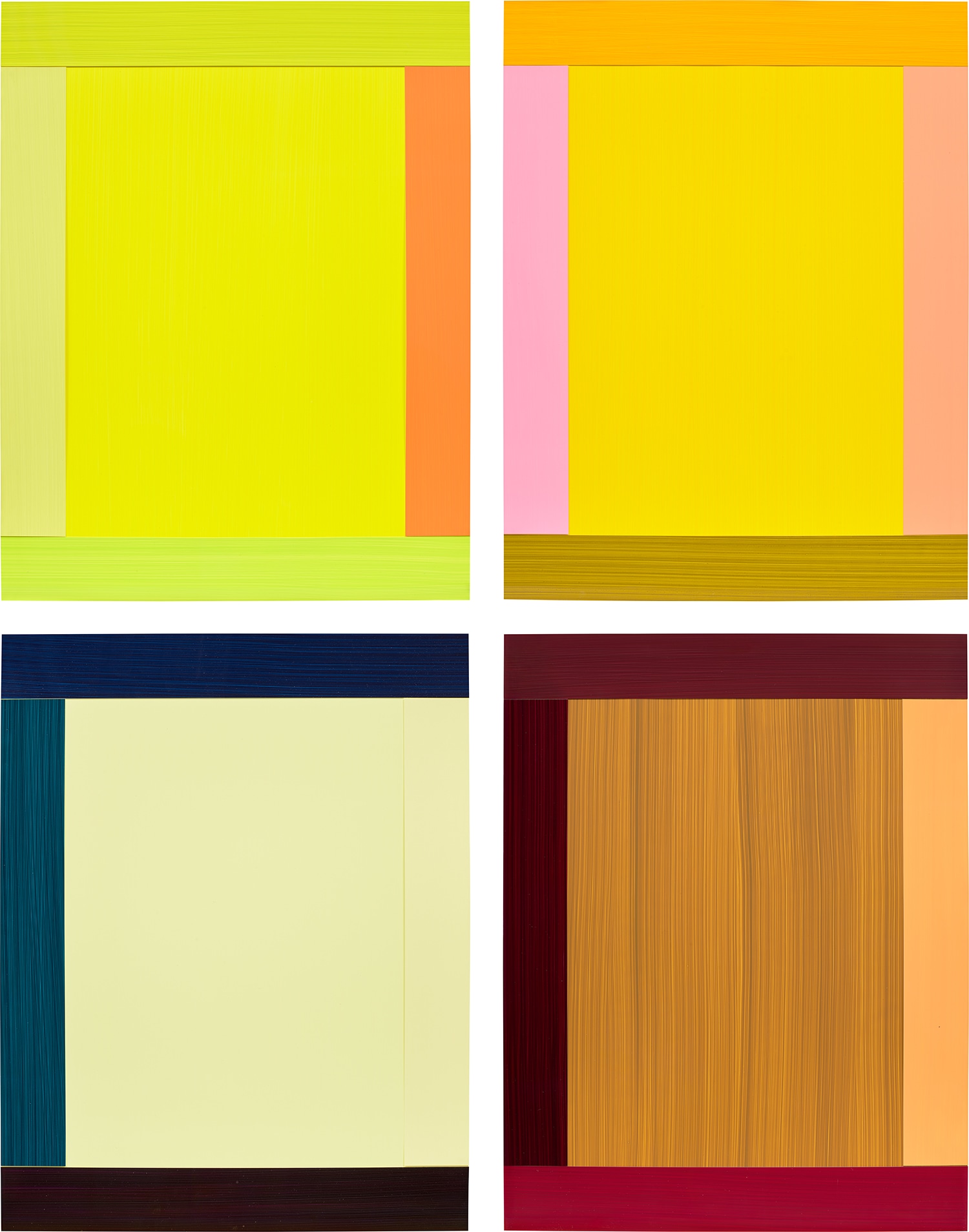The complete set of four collages with acrylic in colours, on constructed and collaged plastic panels, each mounted to Aluminium Dibond.