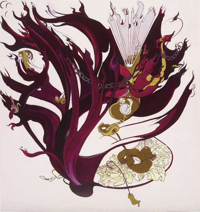 A sinuous, otherworldly figure writhes in an infernal landscape rendered in Inka Essenhigh's signature fluid, enamel-smooth style. The scene pulses with lurid, saturated color as organic forms twist and melt together, blurring the boundary between body and environment. Essenhigh's sleek, cartoon-inflected line work transforms the harrowing subject of damnation into something seductively decorative and eerily hypnotic.