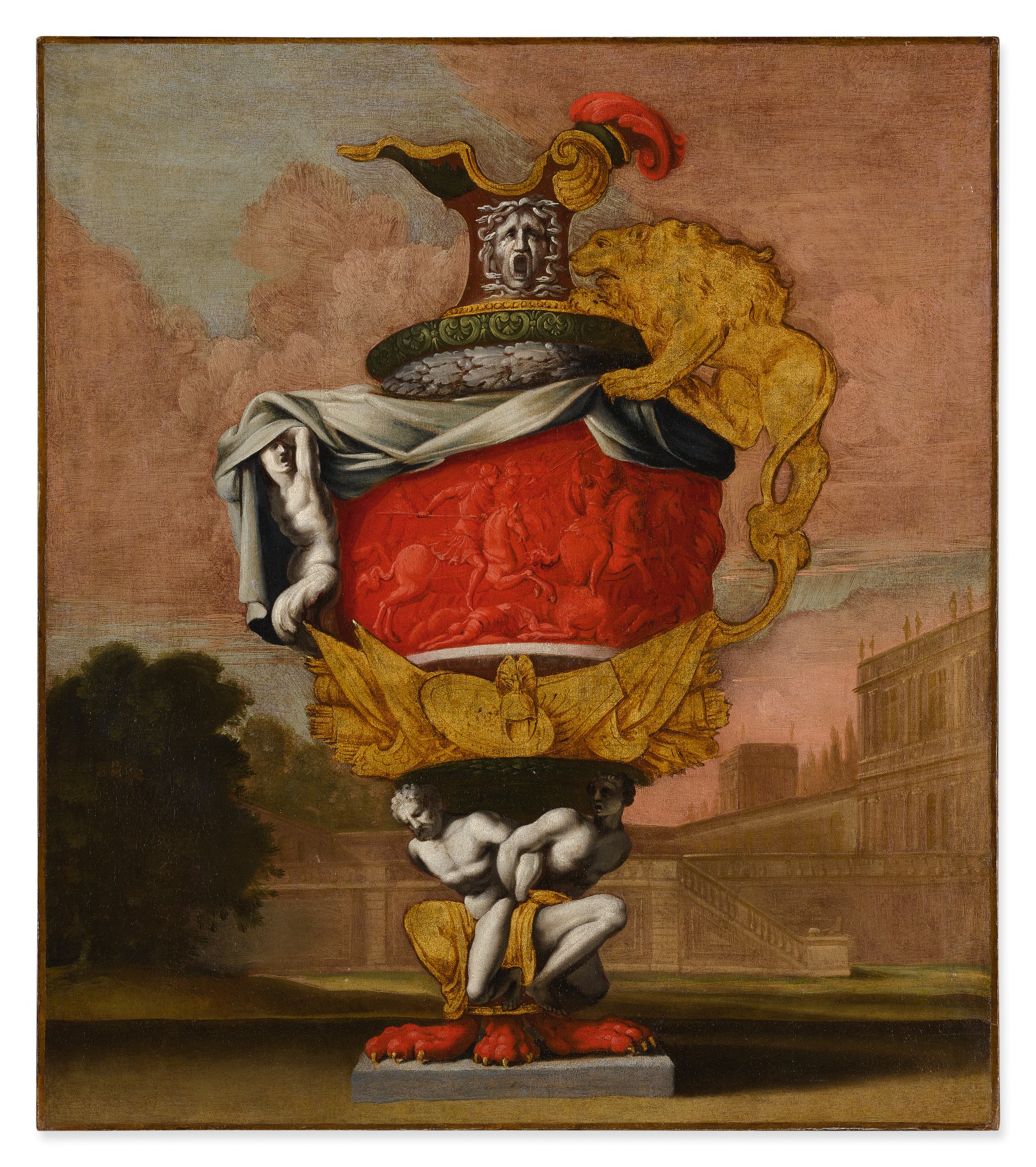 A sumptuous still life rendered in the rich tradition of Italian baroque painting, this eighteenth-century work presents an ornate ewer as its central focus, its lustrous surface catching the light with masterful illusionism. The composition is thoughtfully opened by a sweeping landscape vista beyond, creating a dynamic interplay between the intimate foreground objects and the expansive natural world. Executed in oil on canvas, the work demonstrates the refined technical skill and decorative sensibility characteristic of the Italian school during this period.