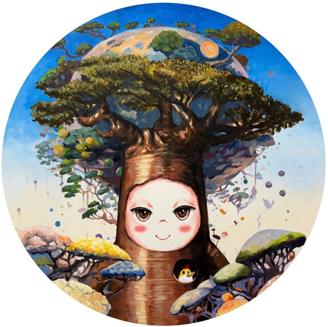 This oil on canvas work presents an imaginative vision of a planet dominated by ancient baobab trees. The artist creates a surreal landscape that merges botanical forms with celestial imagery. The painting explores themes of nature, growth, and otherworldly possibility. Rich color and gestural brushwork bring vitality to this fantastical composition. The work invites viewers to reconsider their relationship with the natural world.